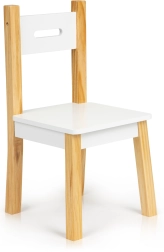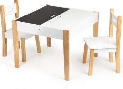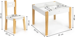 Страхотен комплект за вашето дете, който благодарение на изчистената си форма пасва идеално на всеки детски стаи. Маса с борови крака, които осигуряват стабилност, и MDF плот, лесен за поддръжка и устойчив на повреди.