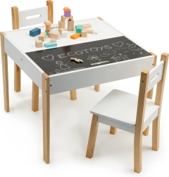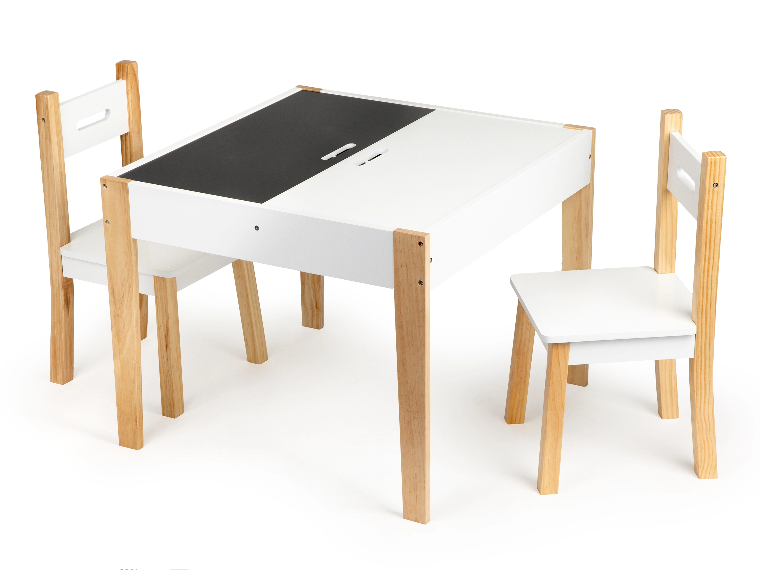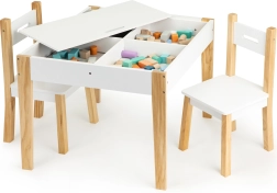 След края на играта всички играчки могат лесно да бъдат подредени под сваляемия плот. Комплектът включва два удобни стола с борови крака.