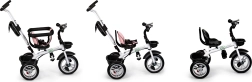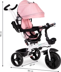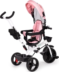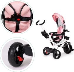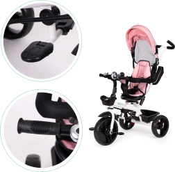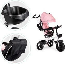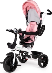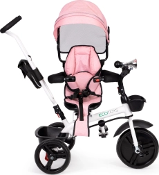 Тази триколка ECOTOYS е оборудвана с здрава стоманена конструкция, която гарантира дълъг живот. Благодарение на въртящата се седалка посоката може лесно да се променя, което е особено удобно за по-малки деца. Подвижният сенник, предпазните бариери и водещата дръжка добавят многофункционалност и възможности за персонализиране.