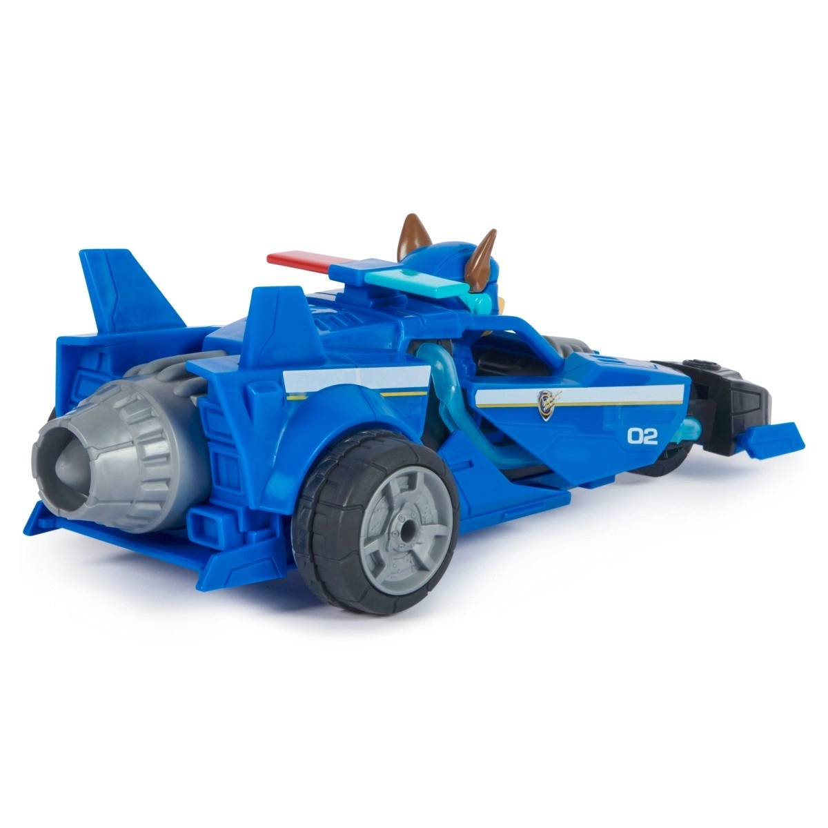 Детайлен полицейски автомобил с номер 02, аеродинамични елементи и фигурка на Чейс – точно както в Пес патрул: Филмът.