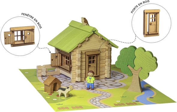 Открийте чара на класическите дървени конструктори JEUJURA. Елементите от буково и борово дърво пасват прецизно и позволяват на децата да строят реалистични къщи с покрив, врати, прозорци и капаци. Включена е и здрава подложка за стабилна игра и експониране.
