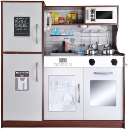 Част от комплекта са метални съдове и прибори: тенджера, тиган, капак и 4 кухненски лъжици (черпак, лъжица за спагети, цедка, лъжица за паста). Подвижната мивка позволява „миене“ на съдовете след игра. Вечният дизайн в комбинация от тъмнокафяво и бяло подхожда на всяка детска стая.