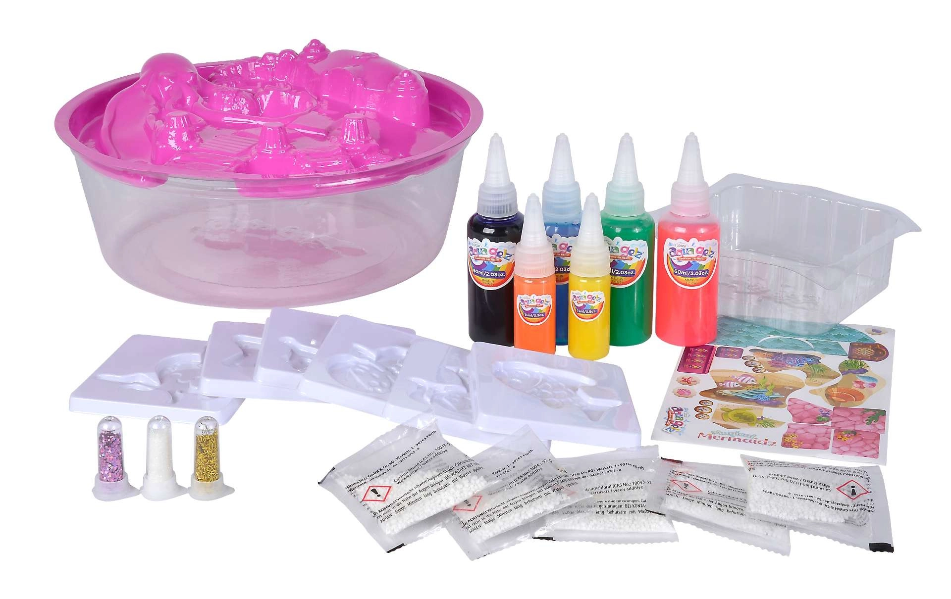 Сетът Aqua Gelz Вълшебни морски русалки носи на децата безкрайно забавление край водата и на масата. С помощта на специален разтвор и цветни гелове те създават за миг 3D фигурки на морски създания и русалки. Благодарение на простата процедура и прецизните апликаторни шишенца творенето е лесно, чисто и увлекателно.