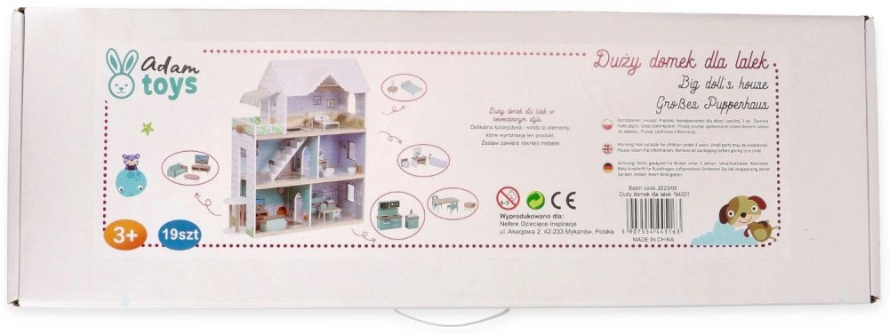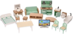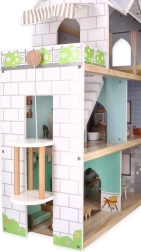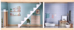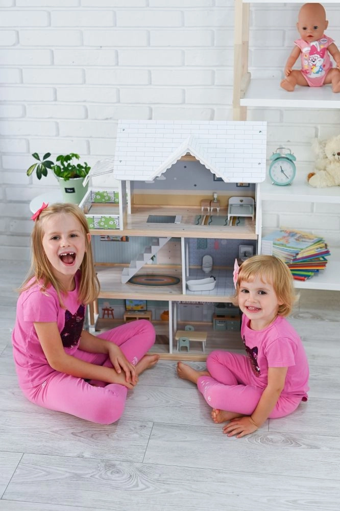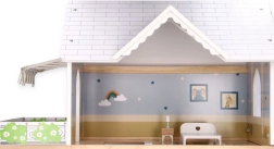 Тази стилна къщичка за кукли от качествено дърво предоставя на децата реалистична среда с всекидневна, кухня, спални и балкон. Благодарение на многоетажното разпределение и богатите детайли подпомага въображението и фината моторика, както и социалните умения при съвместна игра.
