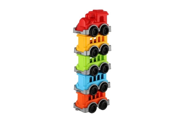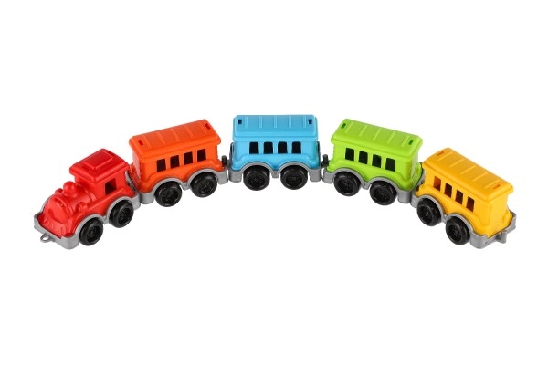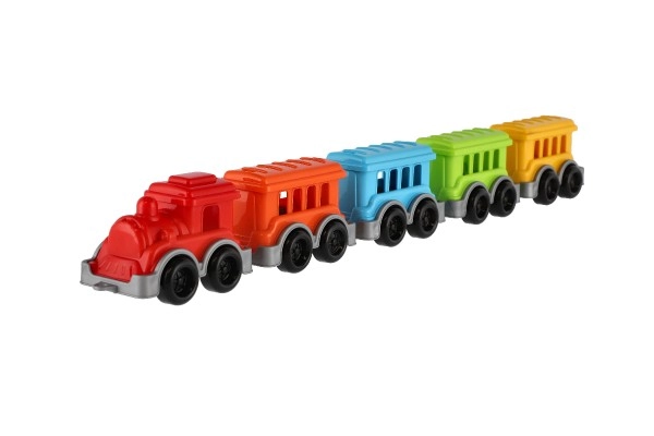 Този цветен влак с локомотив и четири лесно свързващи се вагончета е отличен избор за ежедневна игра. Издръжливата пластмаса се справя с детската употреба, а ярките цветове впечатляват от пръв поглед. Частите се свързват и откачат лесно, което развива координационните умения и логическото мислене.