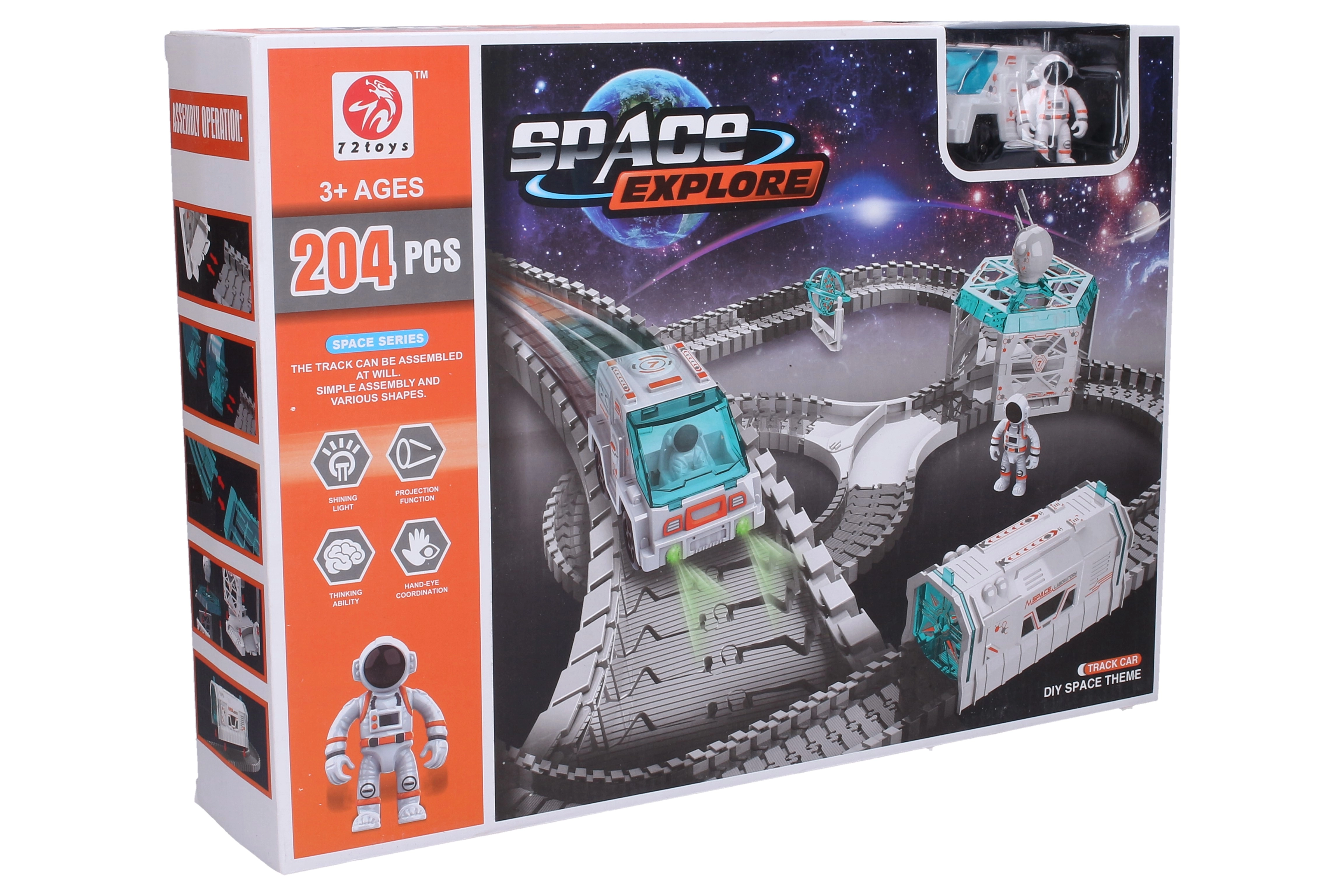 Открийте приключенията в космоса с тази космическа състезателна писта с размери 85 × 75 × 32 см. В комплекта са включени кола, фигурка на космонавт и функционален проектор със светлинни ефекти. Пистата може да се сглобява свободно в различни форми, така че забавлението никога не свършва.