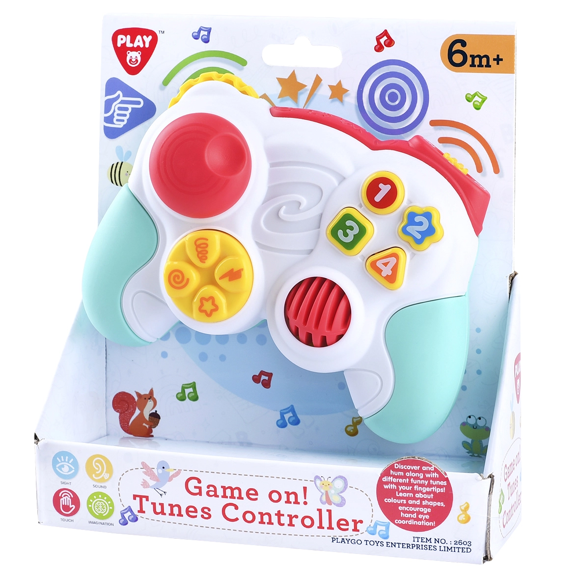 Този сладък геймпад от PlayGo въвежда децата в света на светлините и звуците по безопасен и забавен начин. Ергономичната форма за малки ръчички и интуитивните контролни елементи стимулират любопитството, развиват фината моторика и координацията око–ръка. Благодарение на компактните размери 14,5 × 5,5 × 10,5 см се държи лесно дори от най-малките.