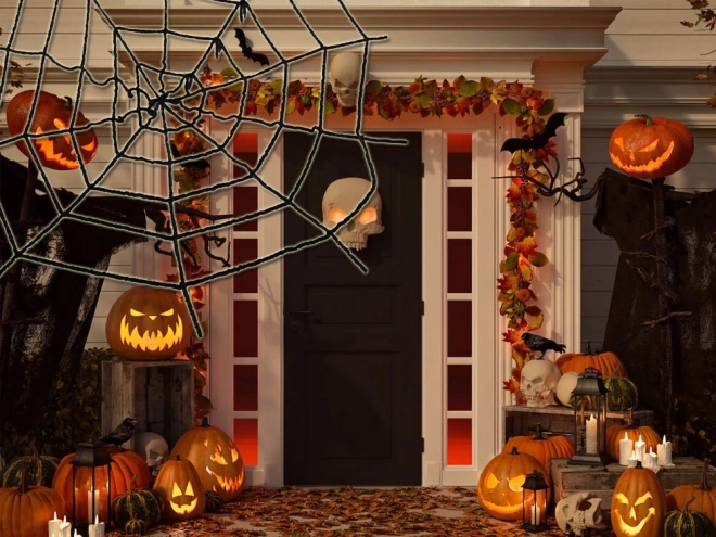 Голямата черна паяжина веднага превръща верандата или входната врата в страховита сцена. Идеална за посрещане на лакомници и декориране на дома.
