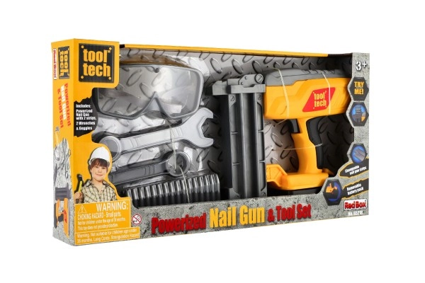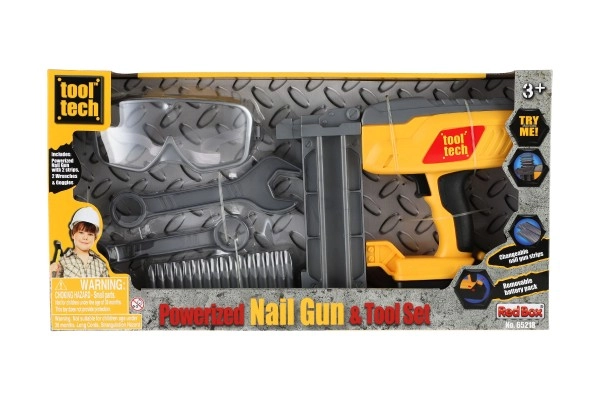 Комплектът включва защитни очила, ключове и пластмасови пирони – всичко изработено от лек и издръжлив пластмасов материал, подходящ за детски ръце.