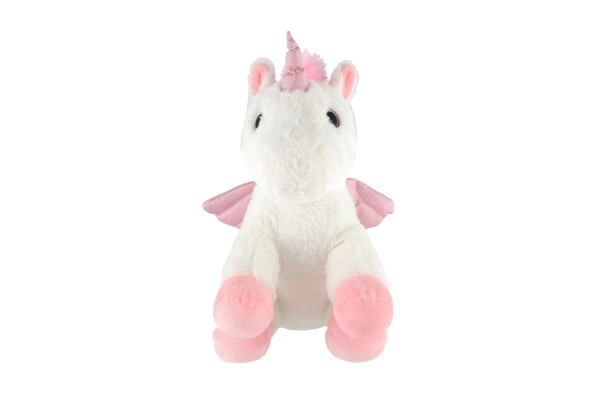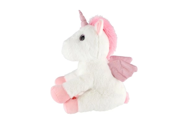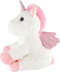 Плюшеният еднорог с мека бяла козина и розови детайли е идеален за гушкане и утеха.