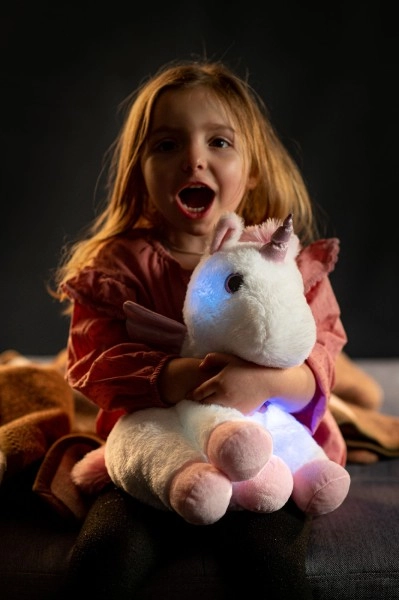 Зарадвайте децата си с плюшено еднорогче, създадено за гушкане, което носи утеха като нощна лампа. Еднорогът има мека бяла козина с розови акценти и при натискане на лапичката пуска релаксираща музика. Сменя цветовете и свети, което създава приказна атмосфера.