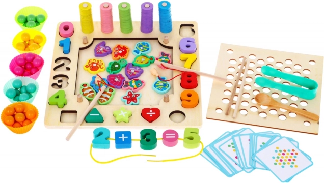 Тази богато оборудвана дървена играчка предлага 6 умно проектирани игри в един сет – от магнитен риболов и низане на мъниста до сортиране на цветове в „cupcake“ чашки. Докато играят, децата развиват фината моторика, търпението, логическото мислене, пространствената ориентация и усвояват основите на броенето и разпознаването на форми.