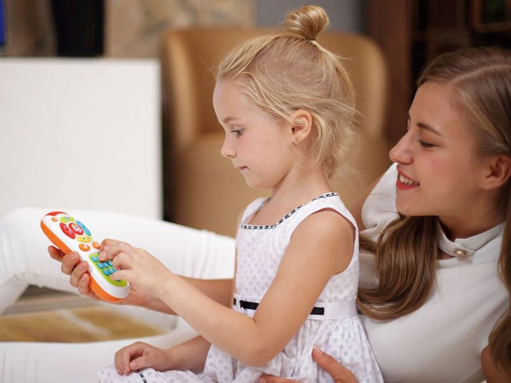 Детето получава собствено „дистанционно“ и може безопасно да „превключва каналите си“. Говорещата на английски играчка помага с произнасянето на първите думи.