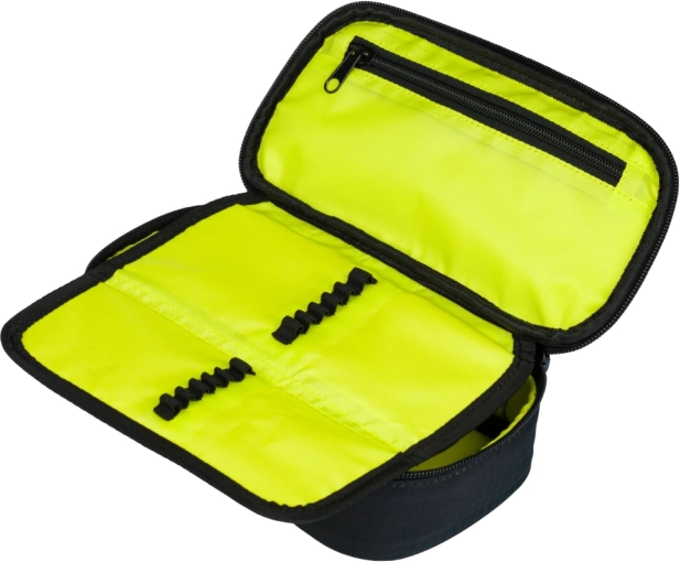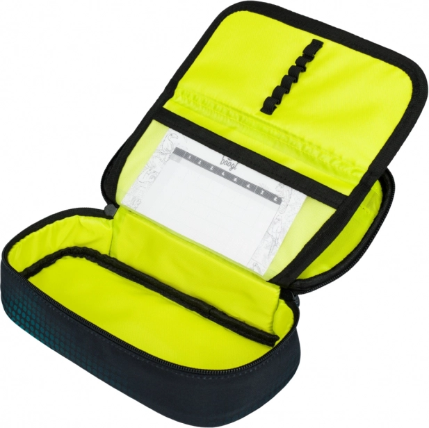 Вътрешното пространство е оборудвано с еластични ластици и джоб с цип, който позволява ефективна организация на писмените принадлежности.