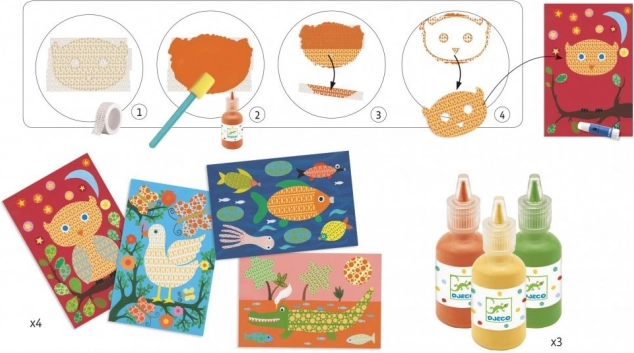 Този игрив творчески комплект предлага на децата прост начин да създадат красиви картинки. Достатъчно е да изберат фон и части на животното, да ги доукрасят с помощта на шаблонни ленти и бои, да оставят да изсъхне и след това да сглобят. Благодарение на гъбичковия апликатор рисуването е чисто и лесно за управление дори за малки ръчички.