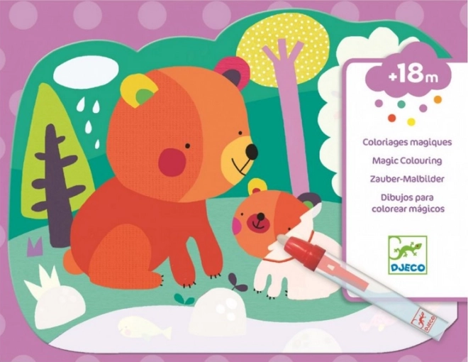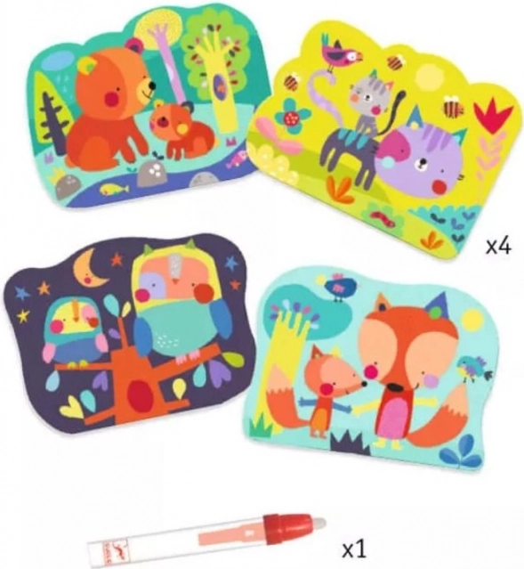 Водните оцветявки DJECO предлагат на деца от 18 месеца лесно и чисто творене без боички. На четири здрави карти с размер 21 × 26 cm при контакт с вода се появяват мили фигурки – меченце, котенце, совичка и лисица. Щом водата изсъхне, картинката се скрива и играта може да започне отново.