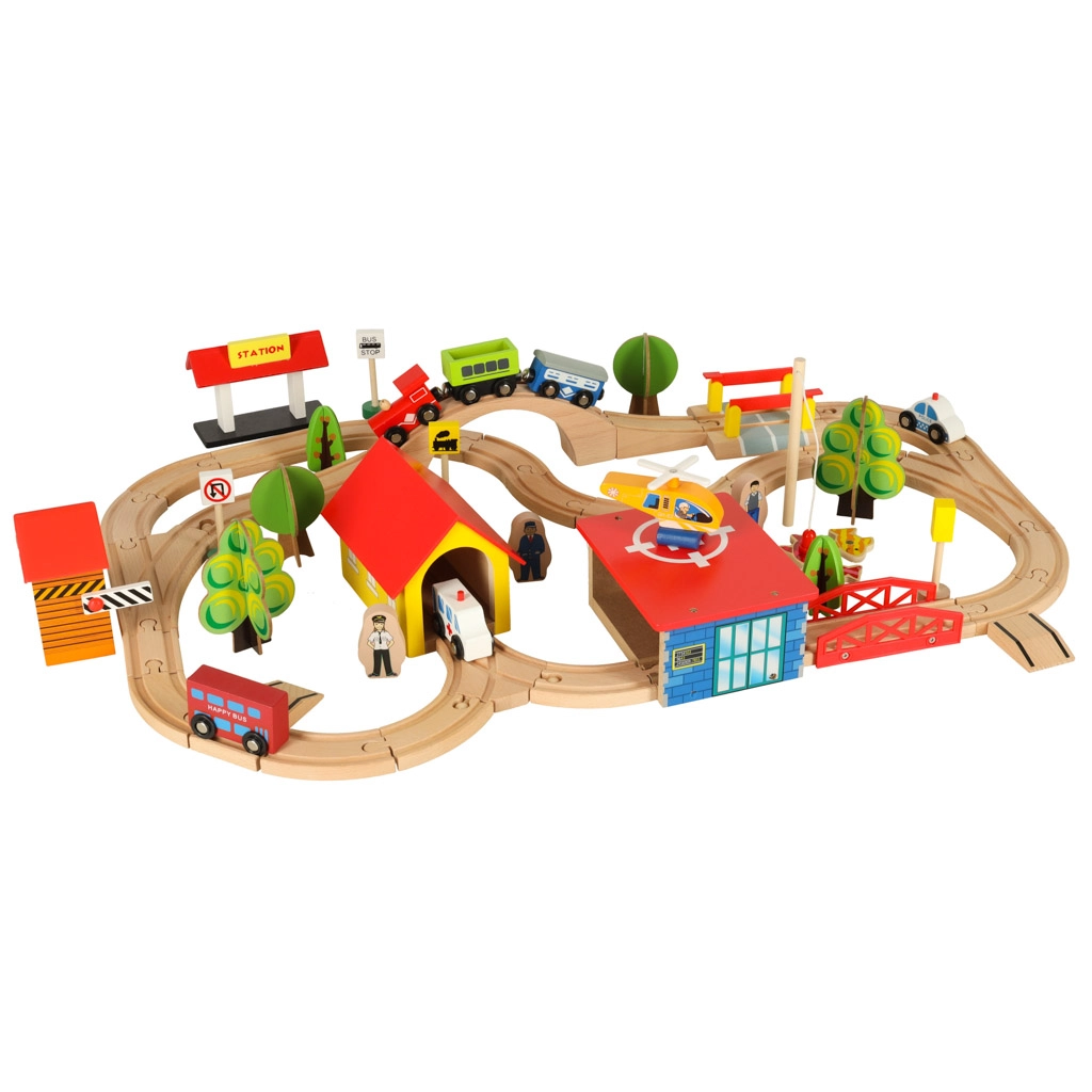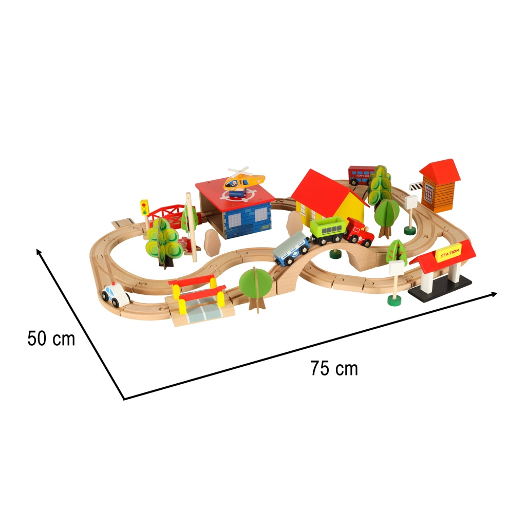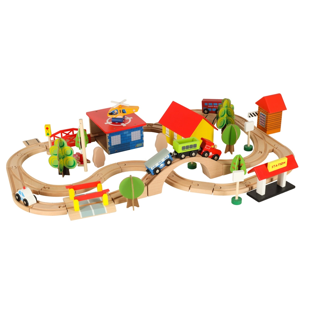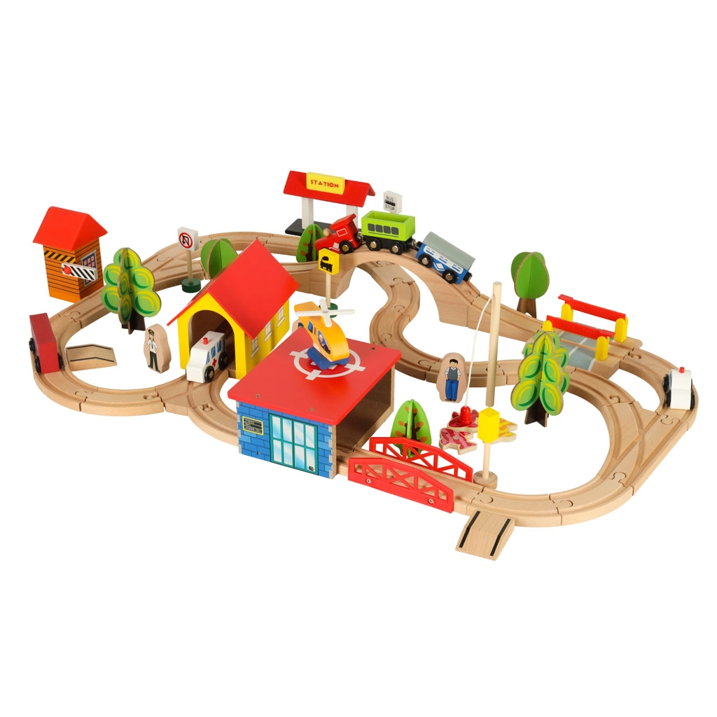 Открийте неограничени възможности с този цветен дървен влаков комплект. Комплектът включва гара, мостове, площадка за кацане на хеликоптер, фигурки и други елементи, които позволяват да създадете свое собствено градче.