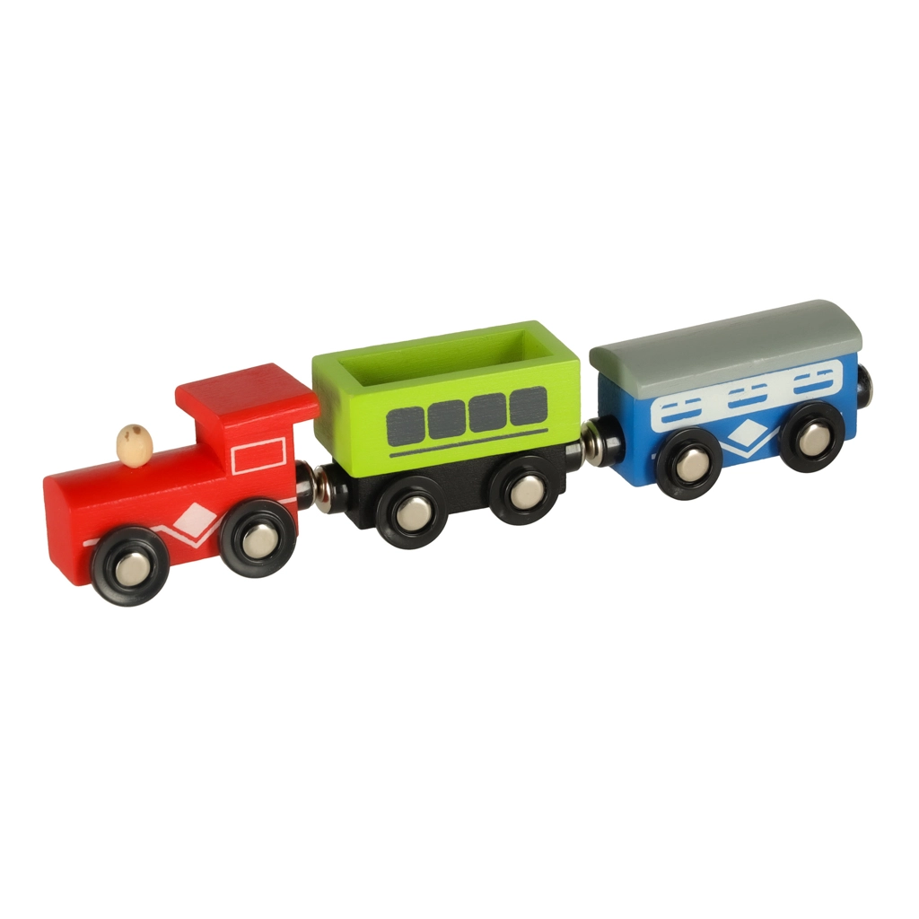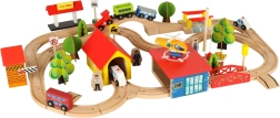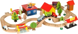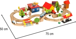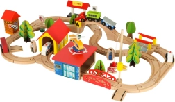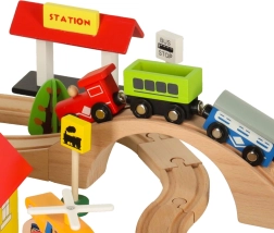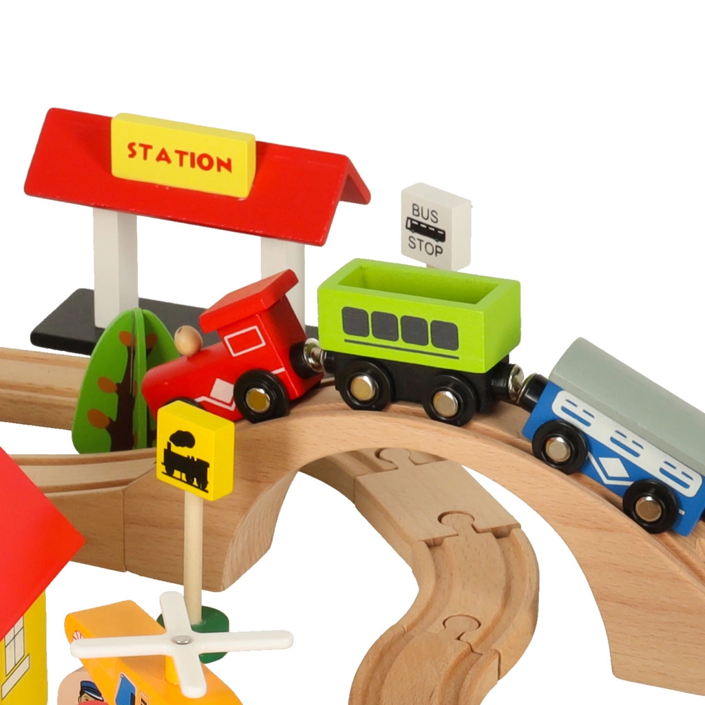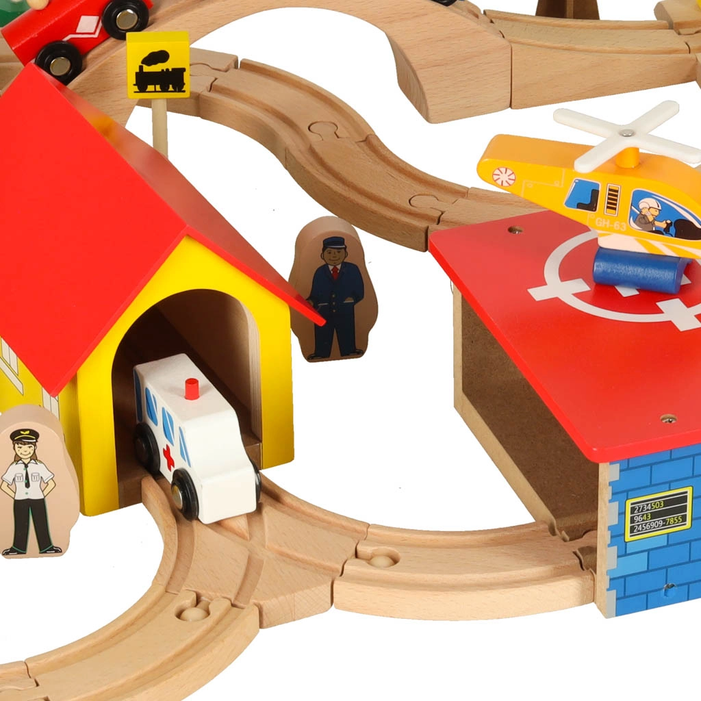Открийте неограничени възможности с този цветен дървен влаков комплект. Комплектът включва гара, мостове, площадка за кацане на хеликоптер, фигурки и други елементи, които позволяват да създадете свое собствено градче.