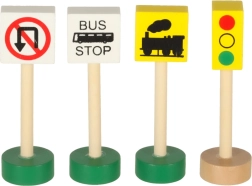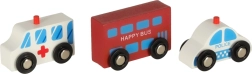 Този дървен комплект позволява на децата да създават собствен град с различни превозни средства и сгради.