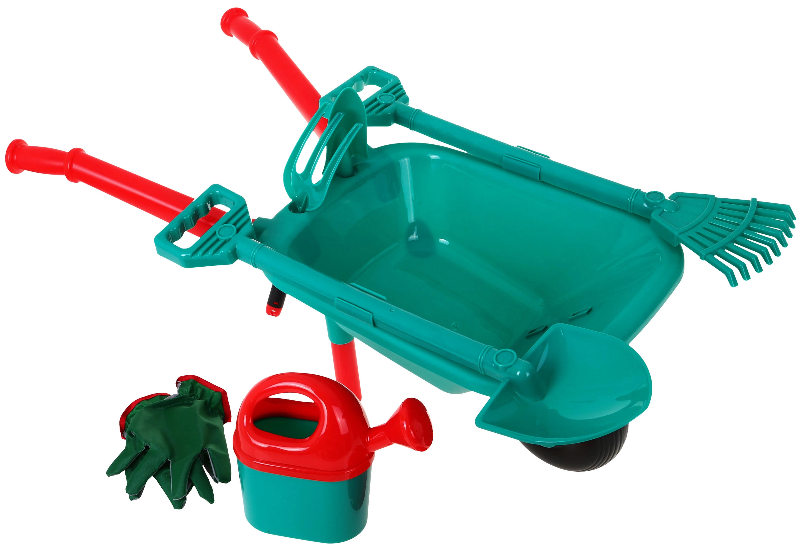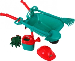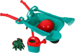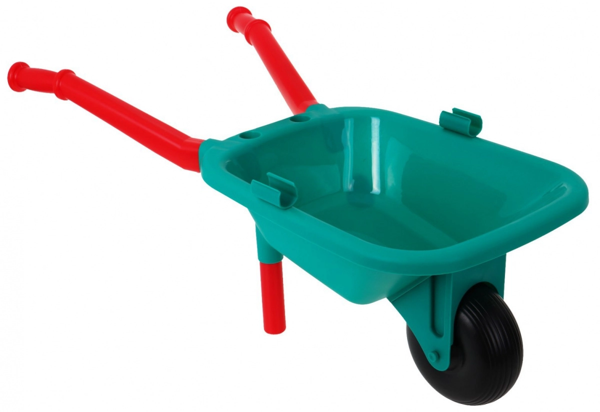 Лека детска количка с здраво колело и удобни дръжки се справя с листа, пръст и играчки. Има практични държачи за закрепване на инструментите, така че всичко да е под ръка.