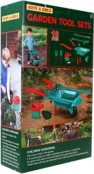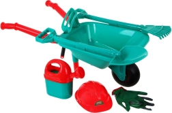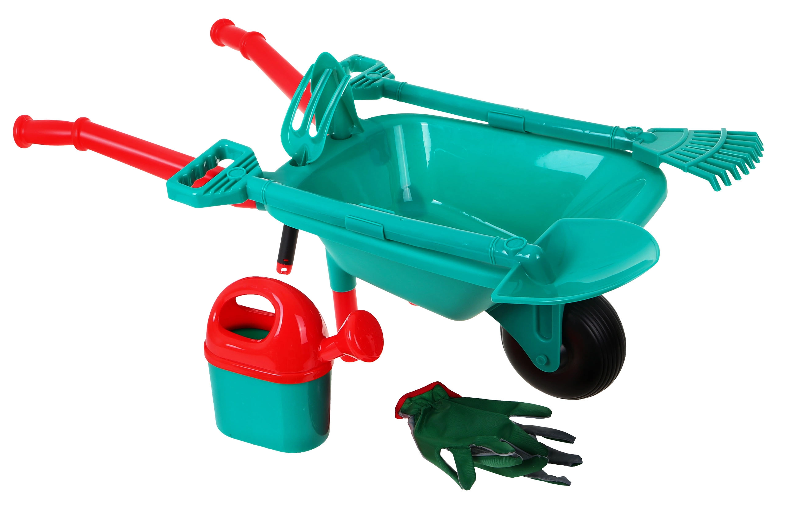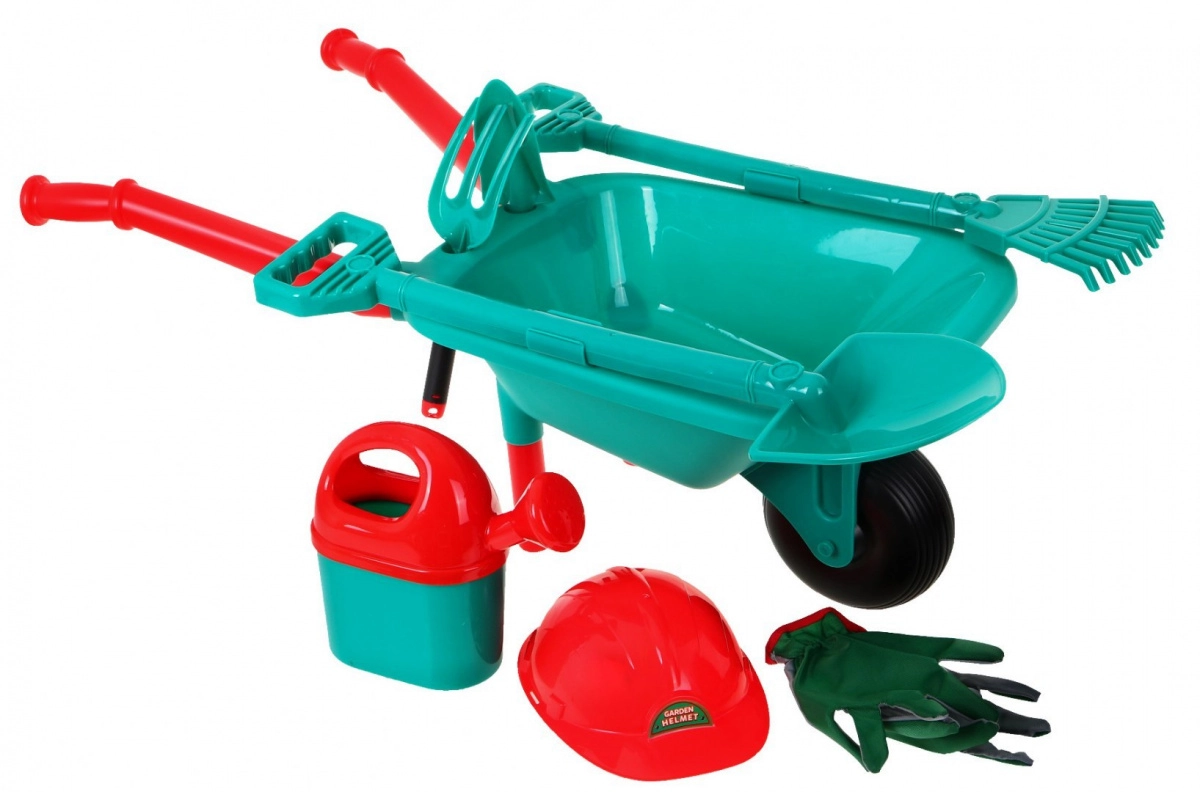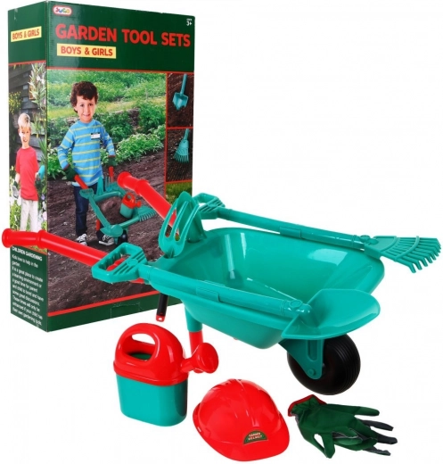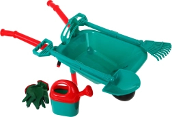 Този цялостен градински комплект позволява на децата да се включат в събиране на листа, пресаждане и поливане. Голямата количка с държачи има практични отвори и куки за закрепване на инструментите, така че децата лесно да носят всичко със себе си. Благодарение на леката пластмасова конструкция инструментите са лесни за боравене, а пъстрите цветове правят силно впечатление от пръв поглед.