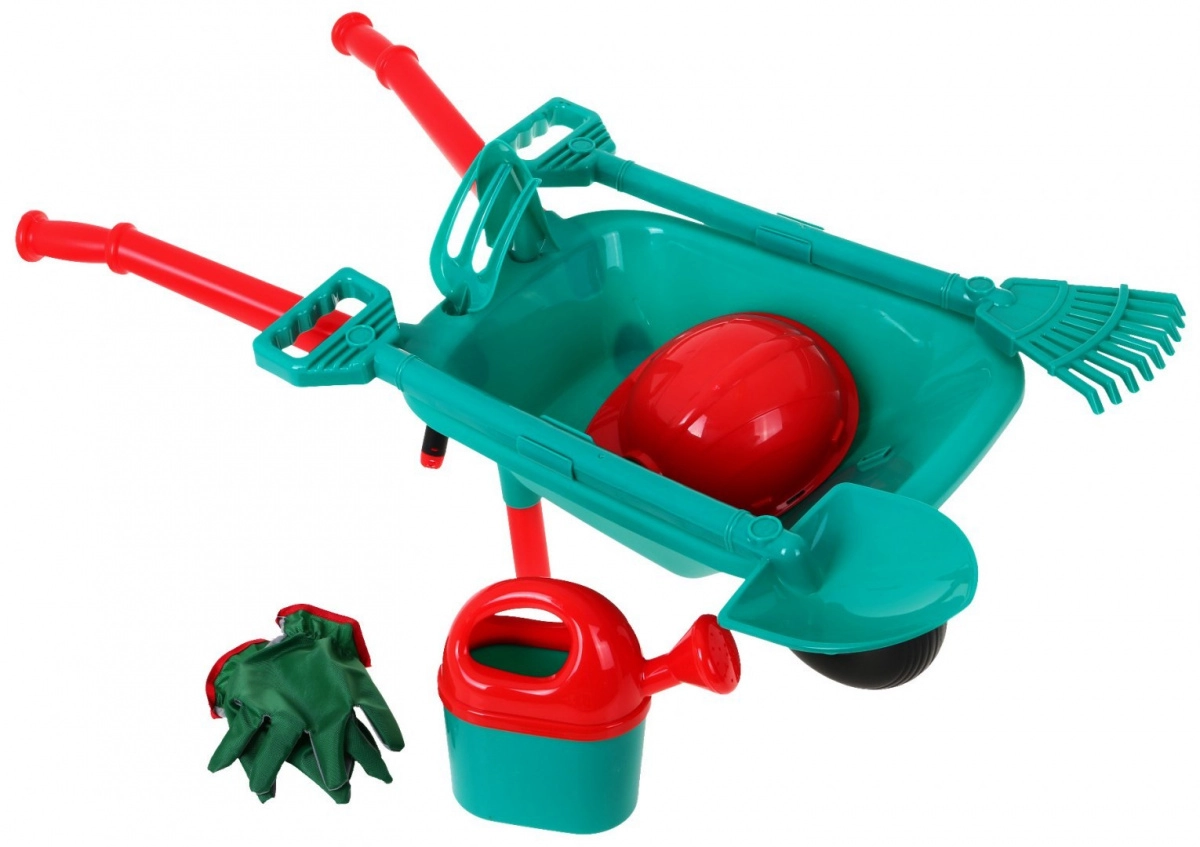 - Количка, голяма лопата, голямо гребло, лейка, ръкавици, малка вила, малка лопатка