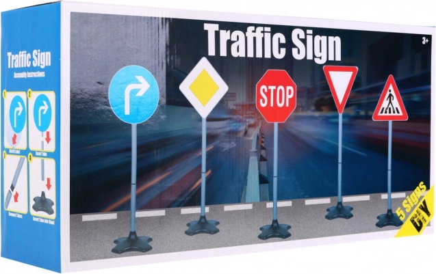 В комплекта са включени пет от най-популярните и най-използвани знаци: STOP, Задължителен завой надясно, Пропусни движещите се по пътя с предимство (Дай предимство), Път с предимство и Пешеходна пътека. Комплектът е чудесно допълнение към детски семафори и други елементи за пътна безопасност.