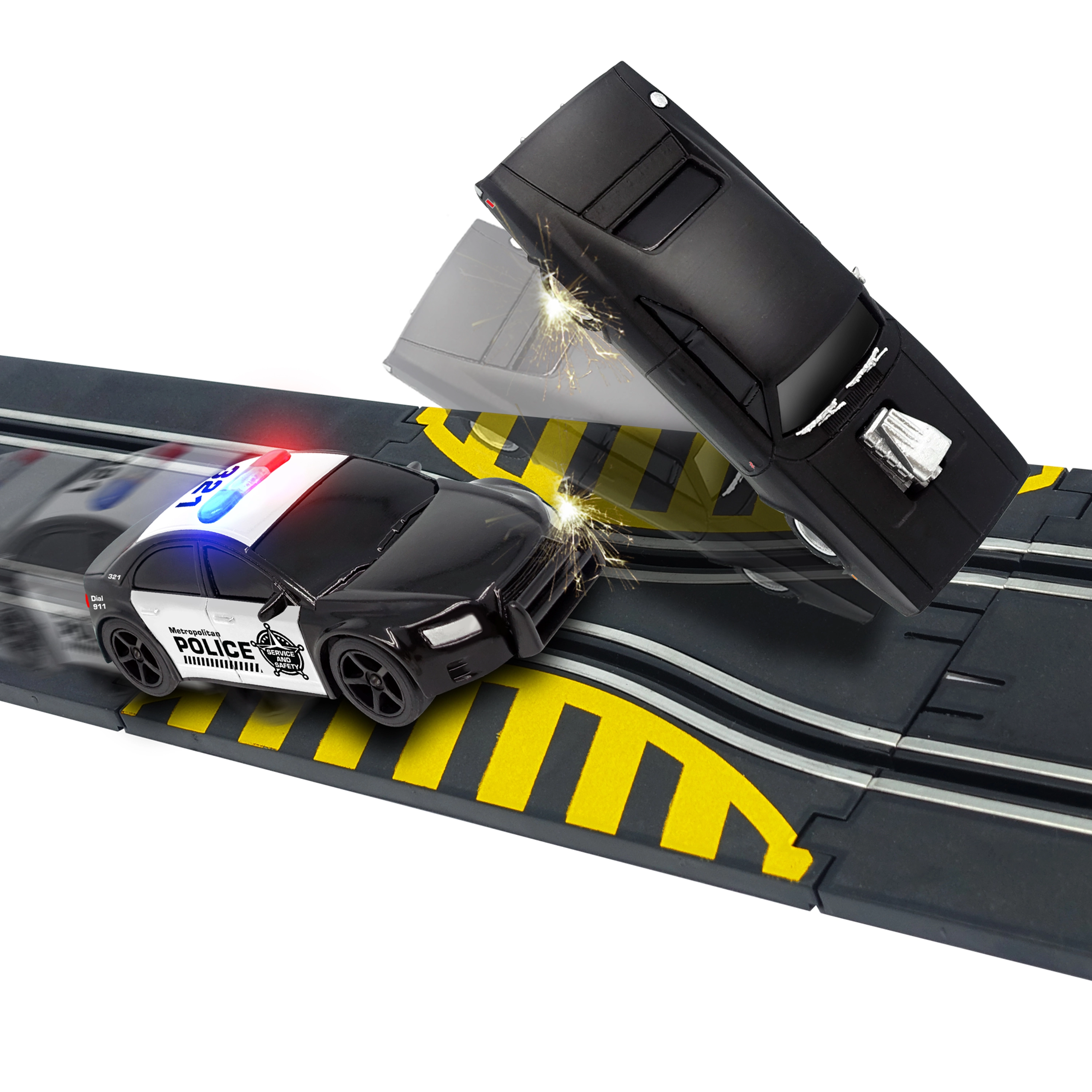 Състезателният сет включва емблематичния Dodge Charger R/T 1970 и полицейски автомобил за автентични преследвания в стил FAST & FURIOUS.