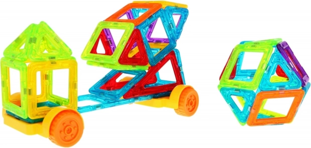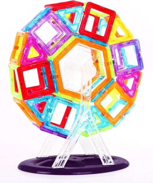 Тази цветна магнитна конструкторна игра носи на децата часове творческо забавление. Частите с различни форми се свързват интуитивно и позволяват строеж на стабилни модели – от прости 2D фигури до 3D конструкции, включително превозни средства и любимо виенско колело. Играта подпомага креативното мислене, концентрацията и разпознаването на форми и цветове.