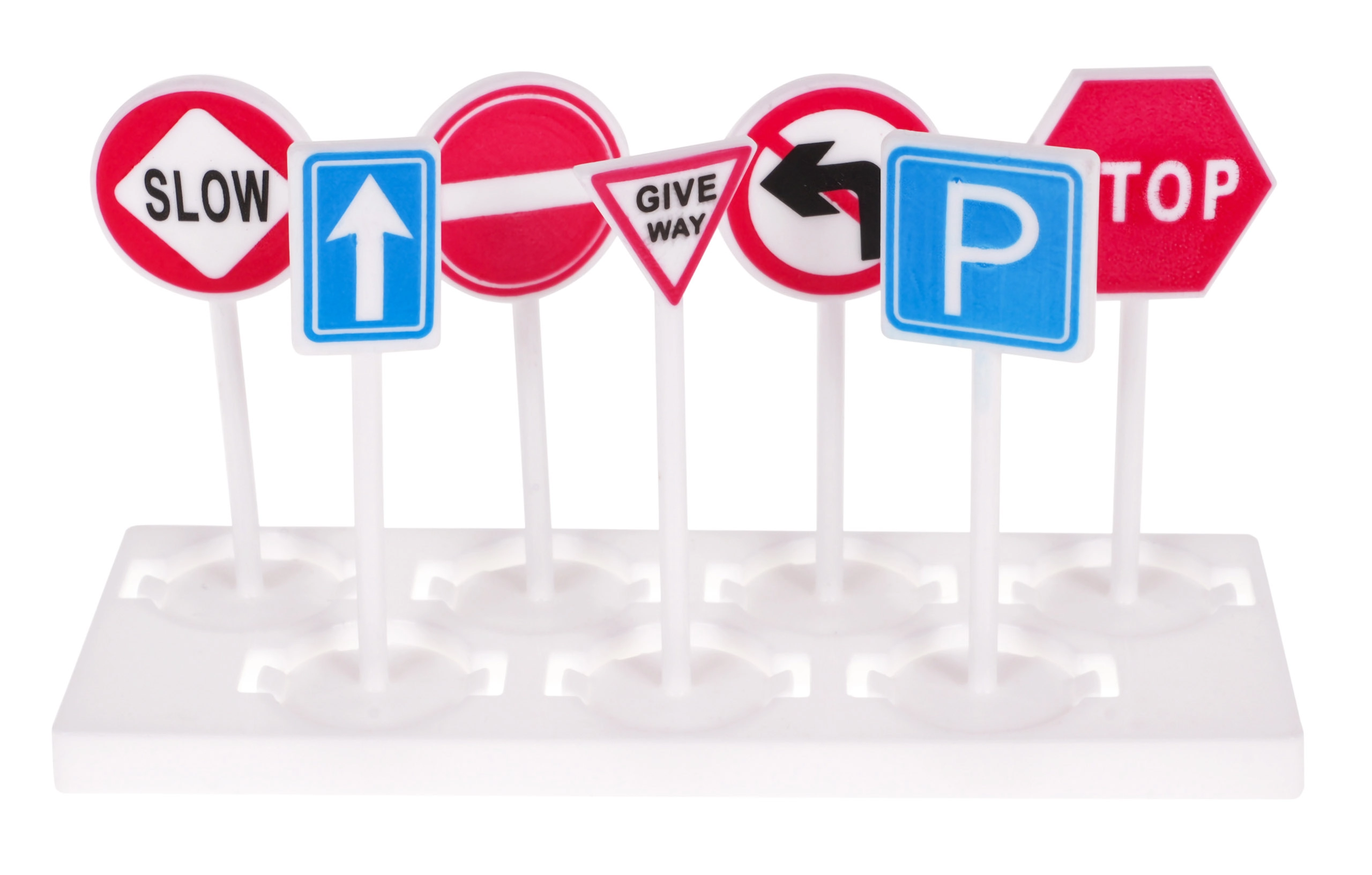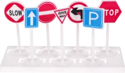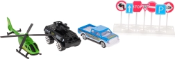 - конструктивни елементи на паркинга, игрална подложка, 2 метални колички, хеликоптер, 7 пътни знака, декоративни стикери, илюстрирано ръководство