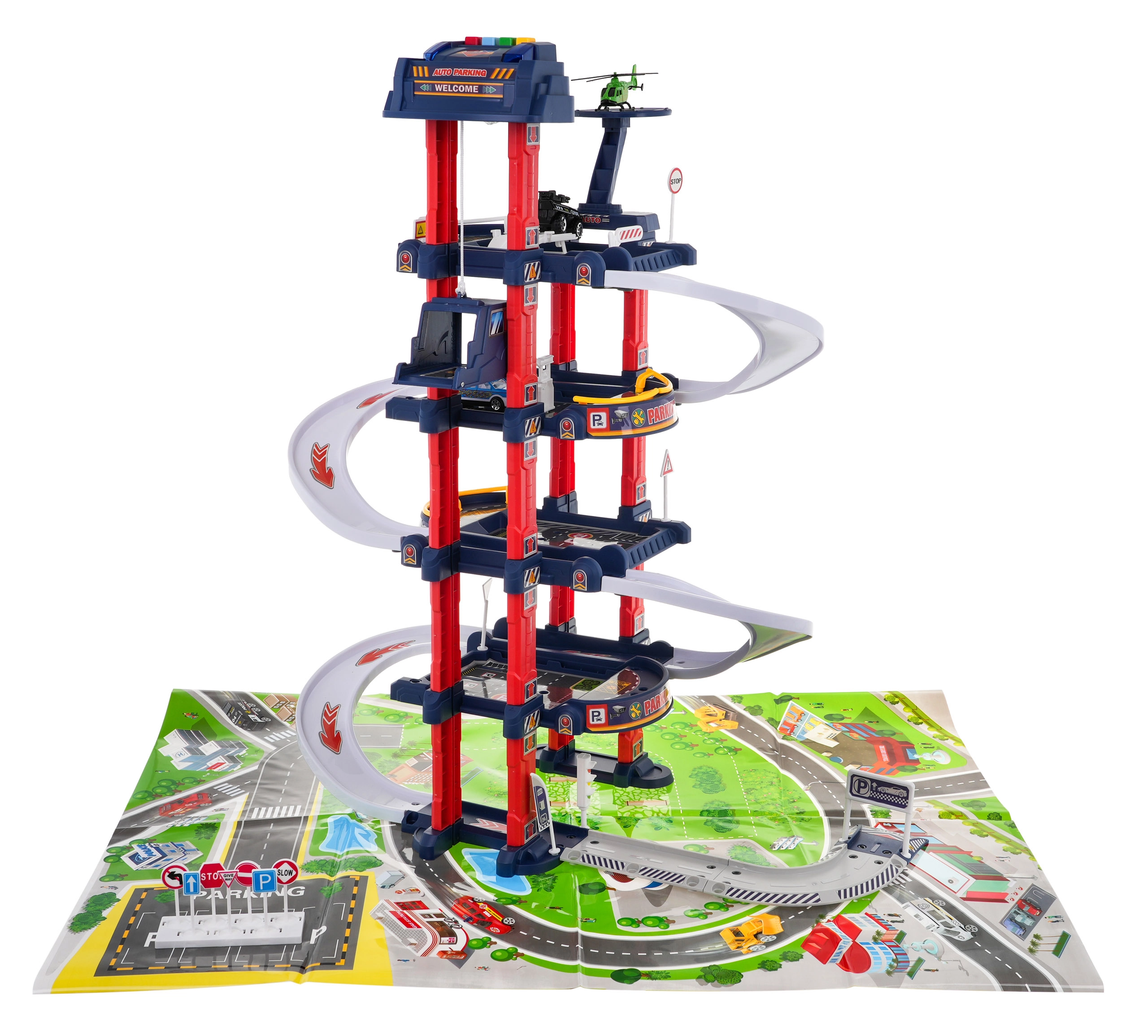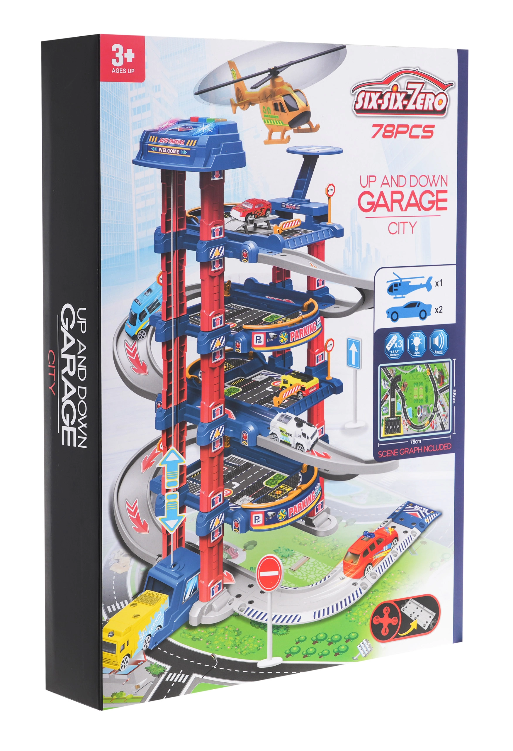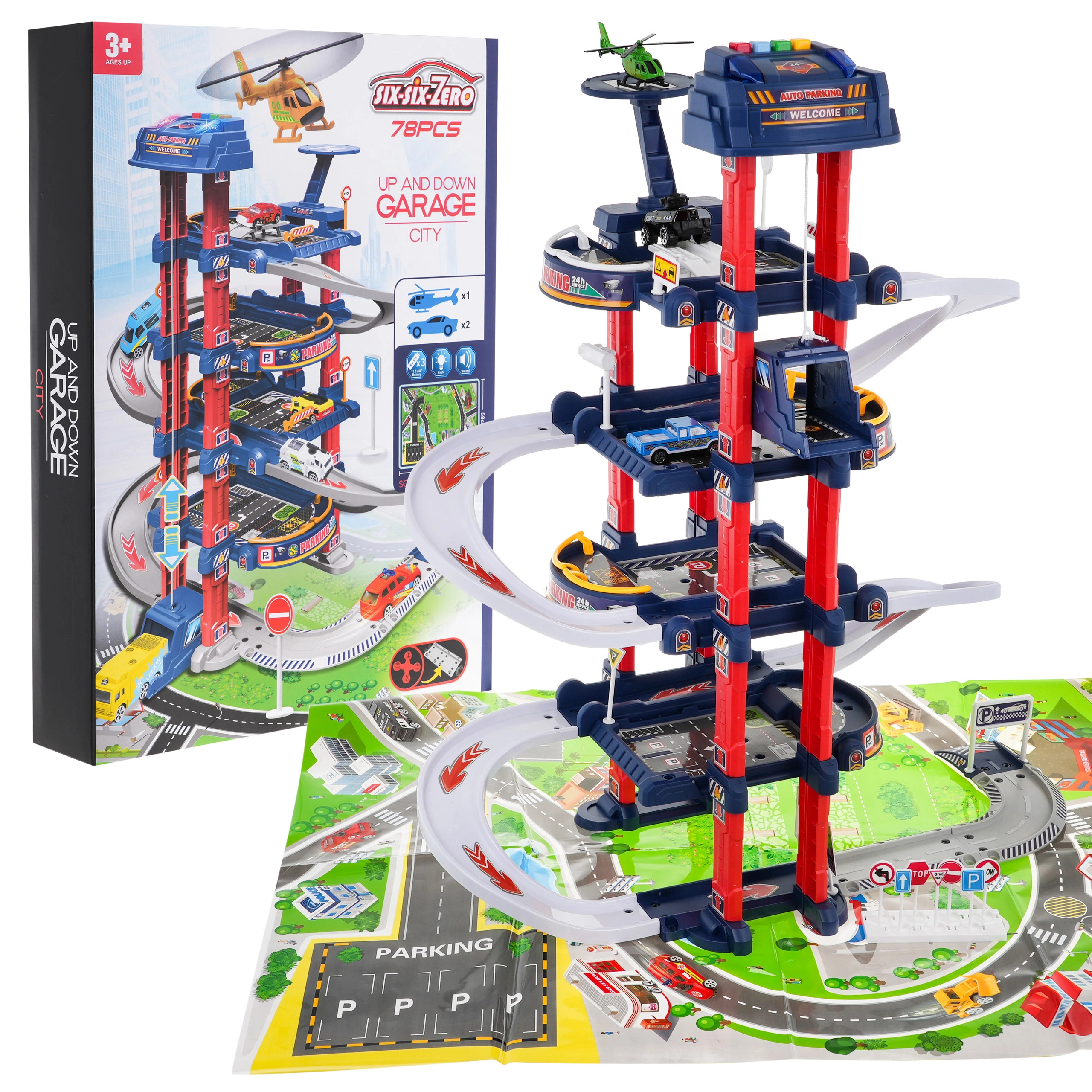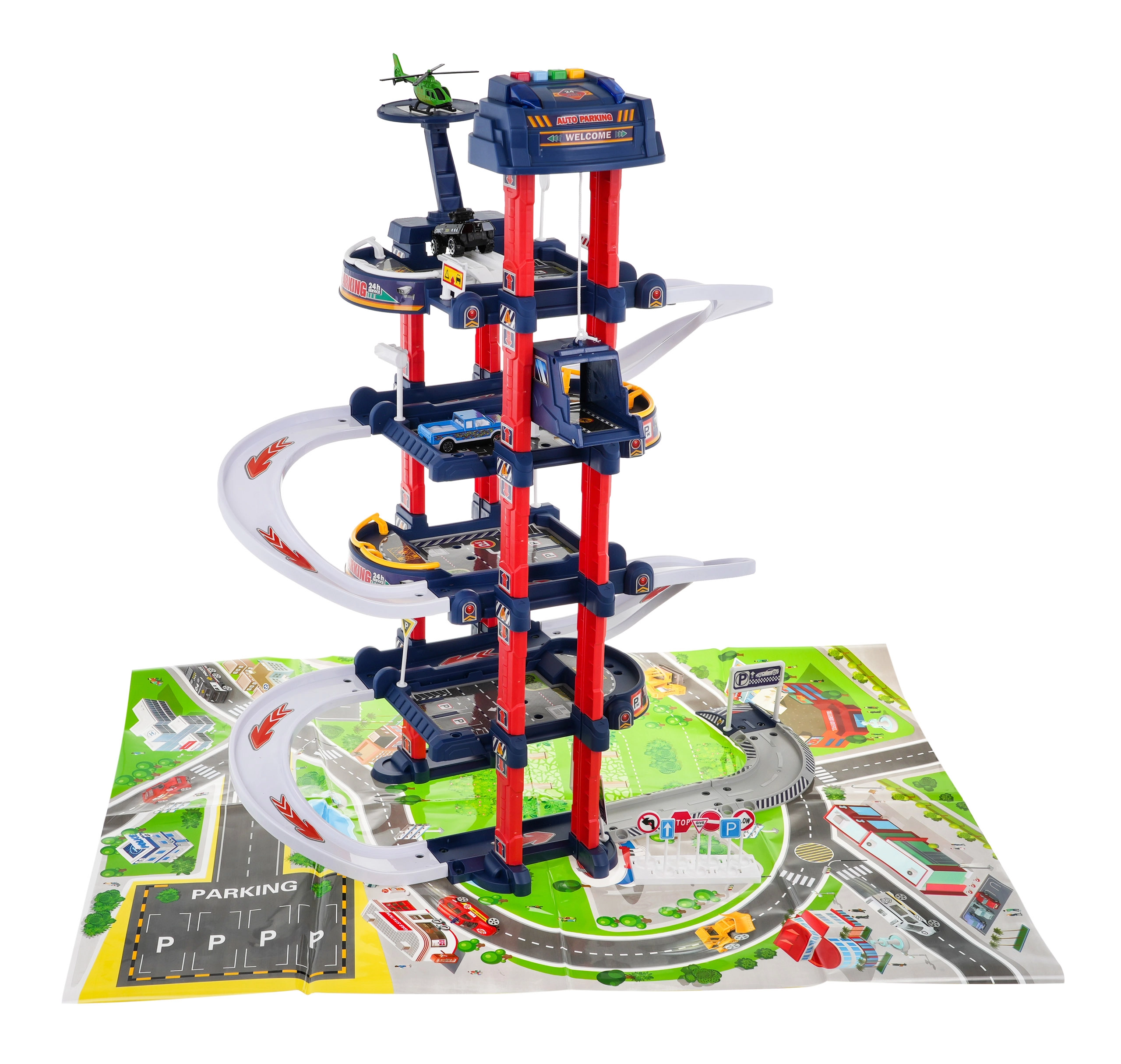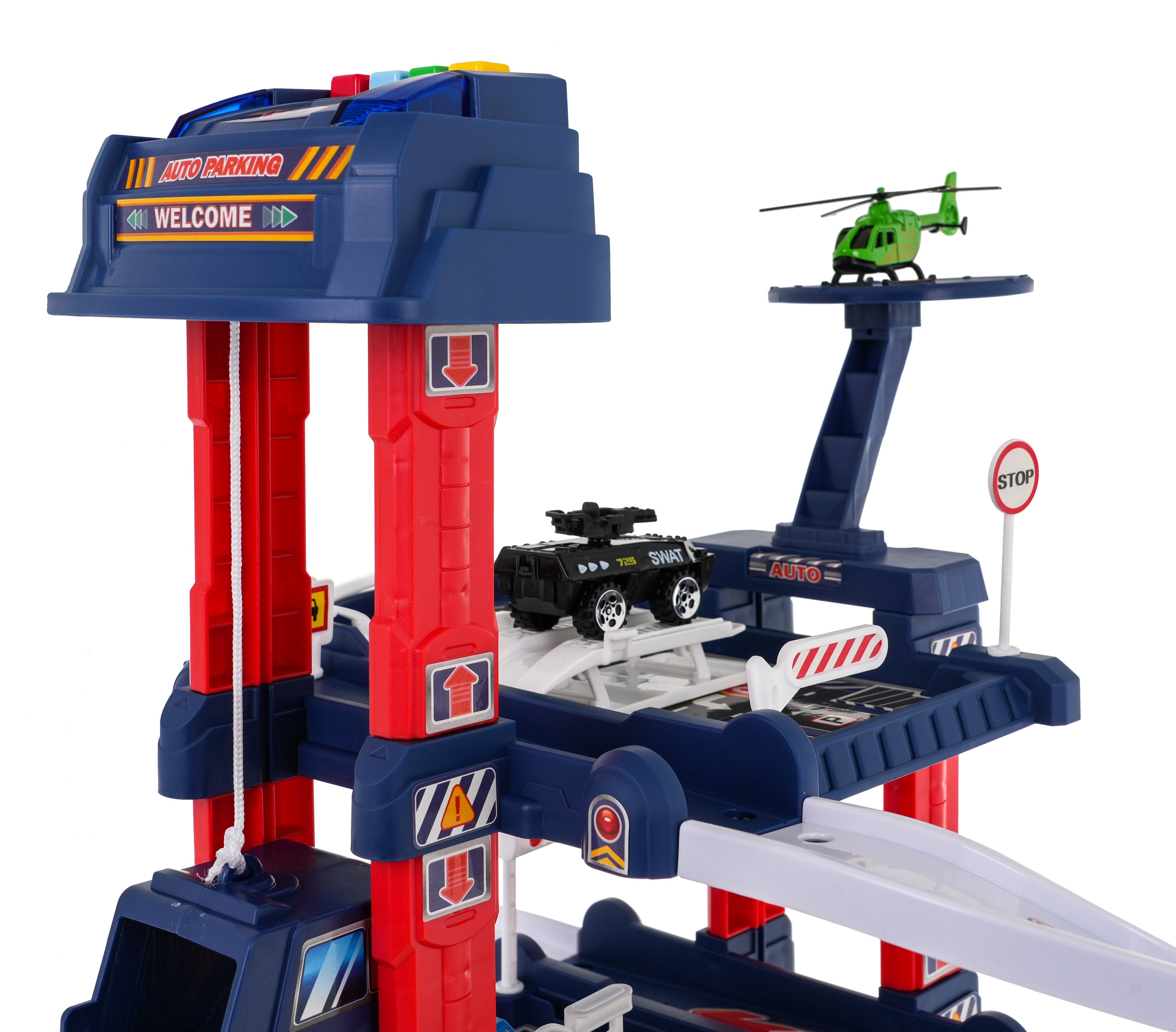 Многоетажният паркинг предлага места за паркиране, бензиностанция, повдигач за автомобили и хелипад. Контролният панел с цветни бутони управлява асансьора и активира ефектите: червеният бутон спуска асансьора надолу, жълтият го вдига нагоре. Синият бутон възпроизвежда звуци на полиция, пожарна, линейка, стартиране на двигател и стрелба, зеленият бутон активира клаксон. На панела мигат сини и червени светлини, които подсилват атмосферата на играта.