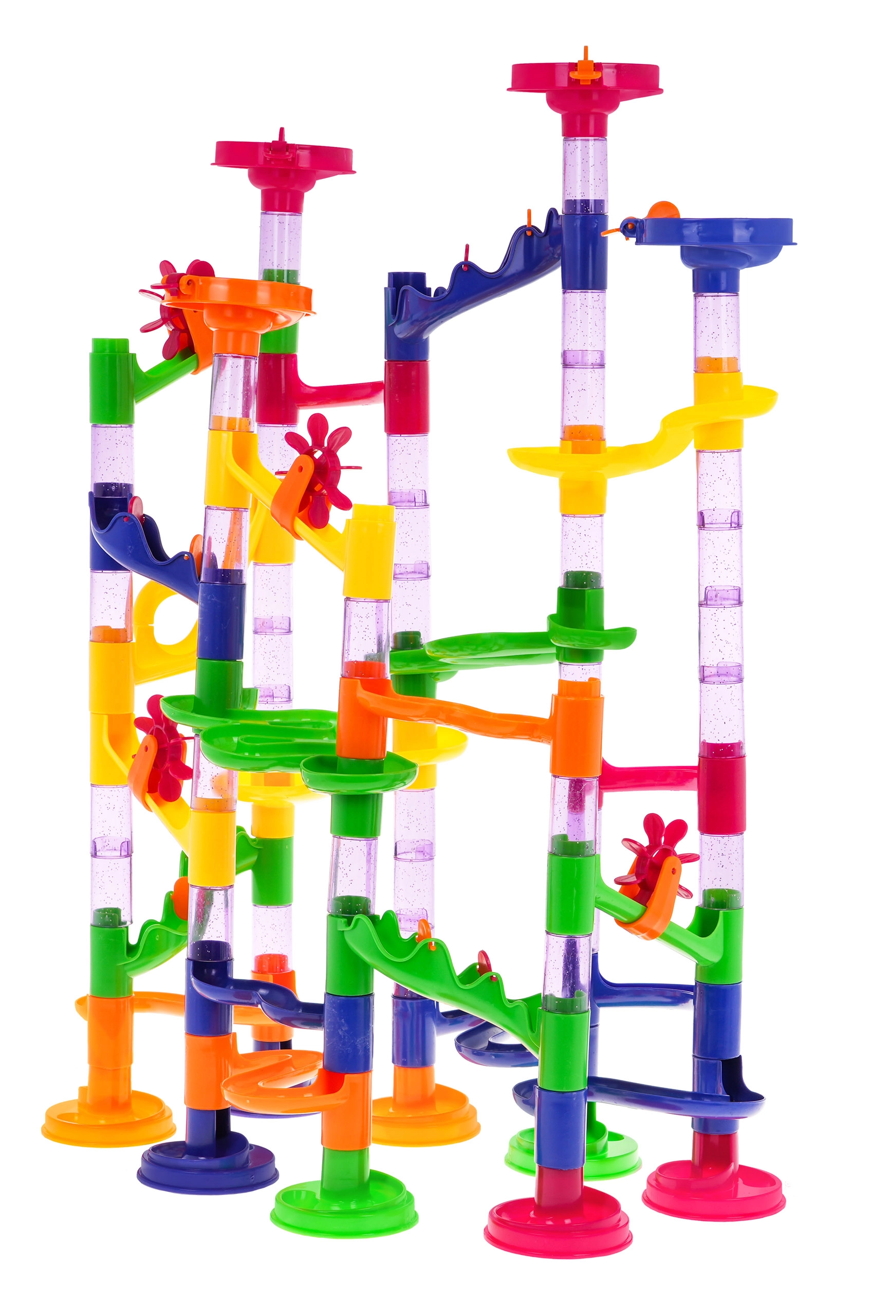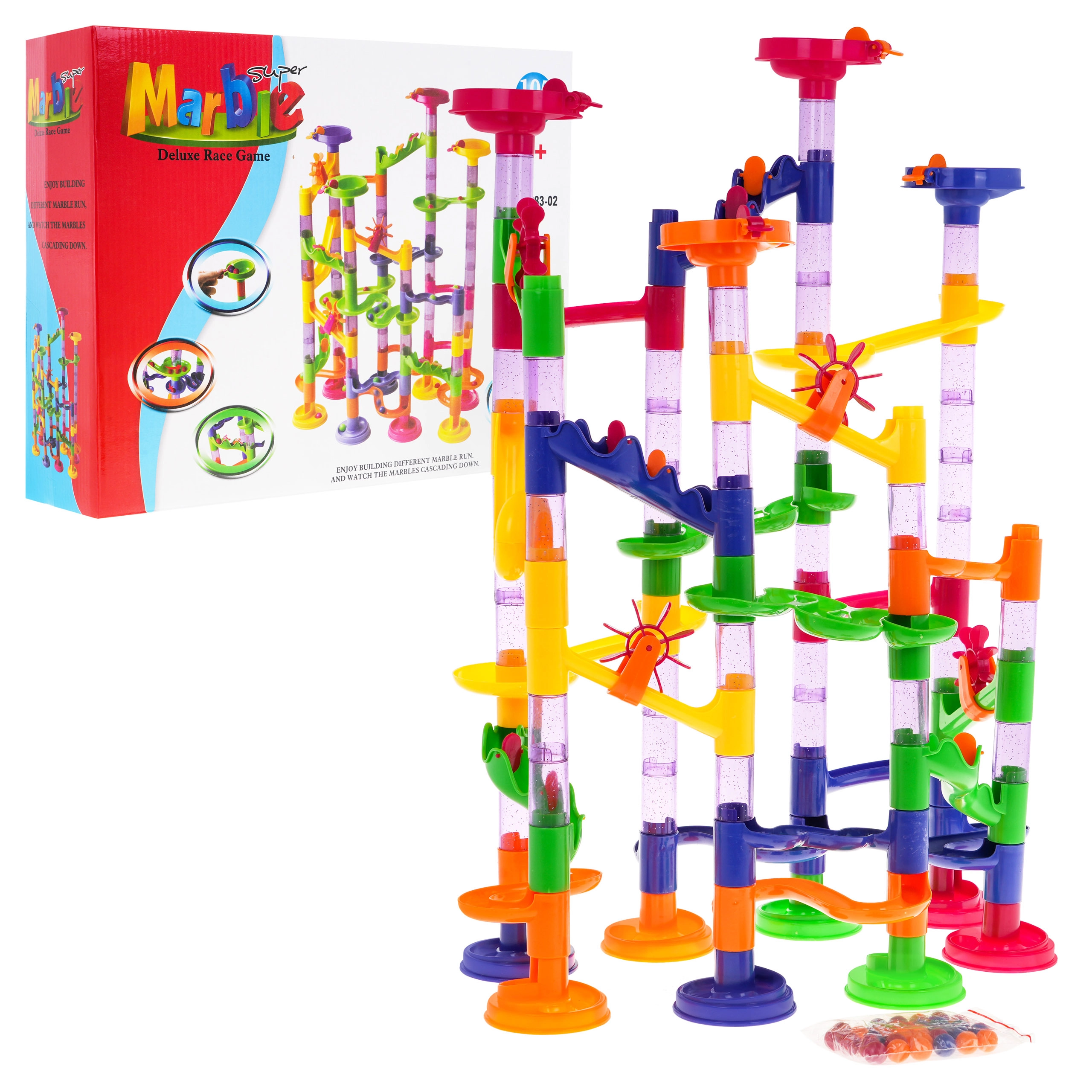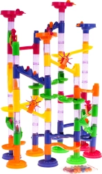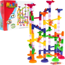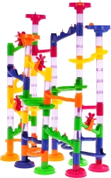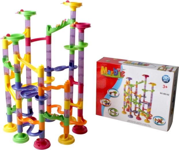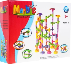 Тази писта за топчета предлага цветни и здрави конструкции, подходящи за деца от 3 години. Сглобяването на пистата е забавно и позволява творческо изразяване. Комплектът съдържа 105 конструктивни части и 30 топчета, което дава възможност за много варианти и забавление.