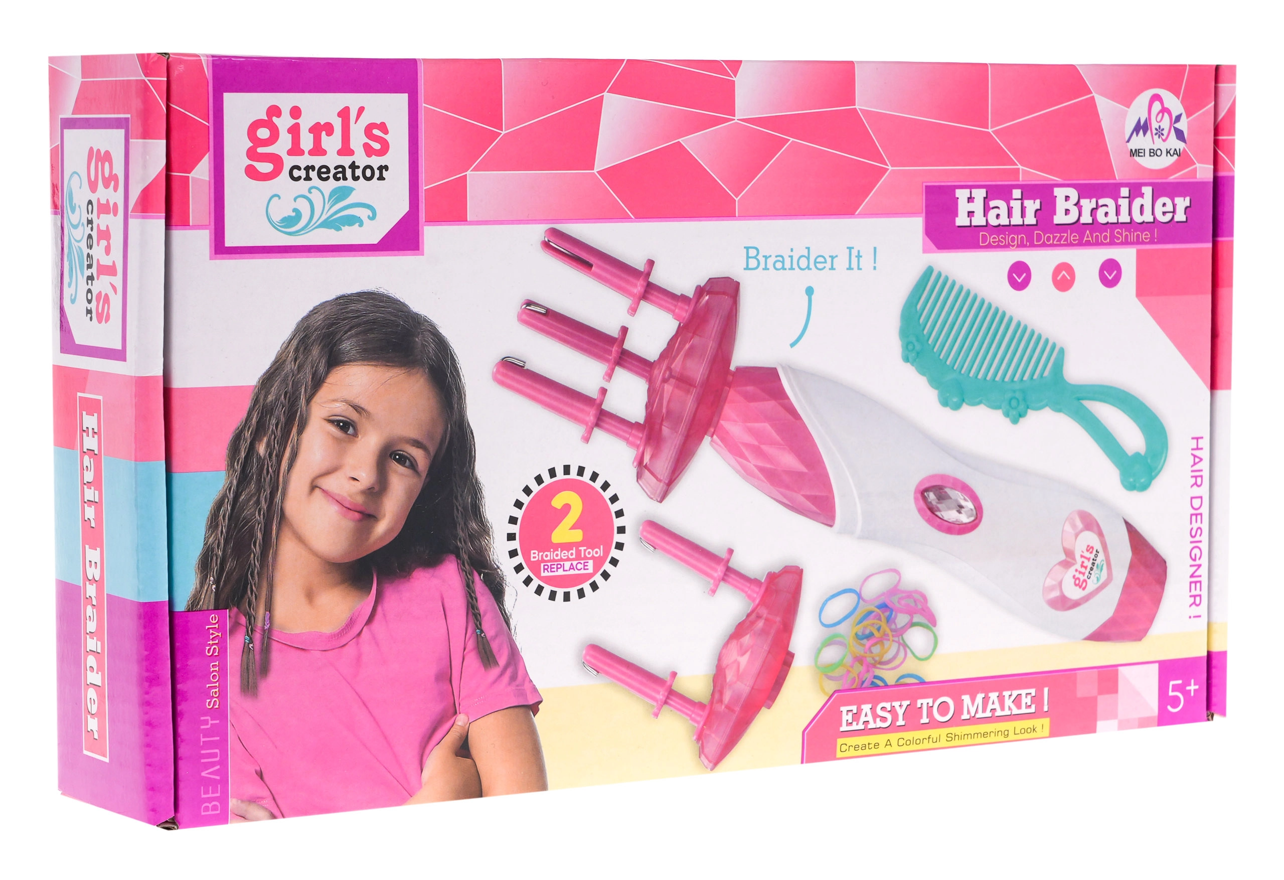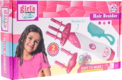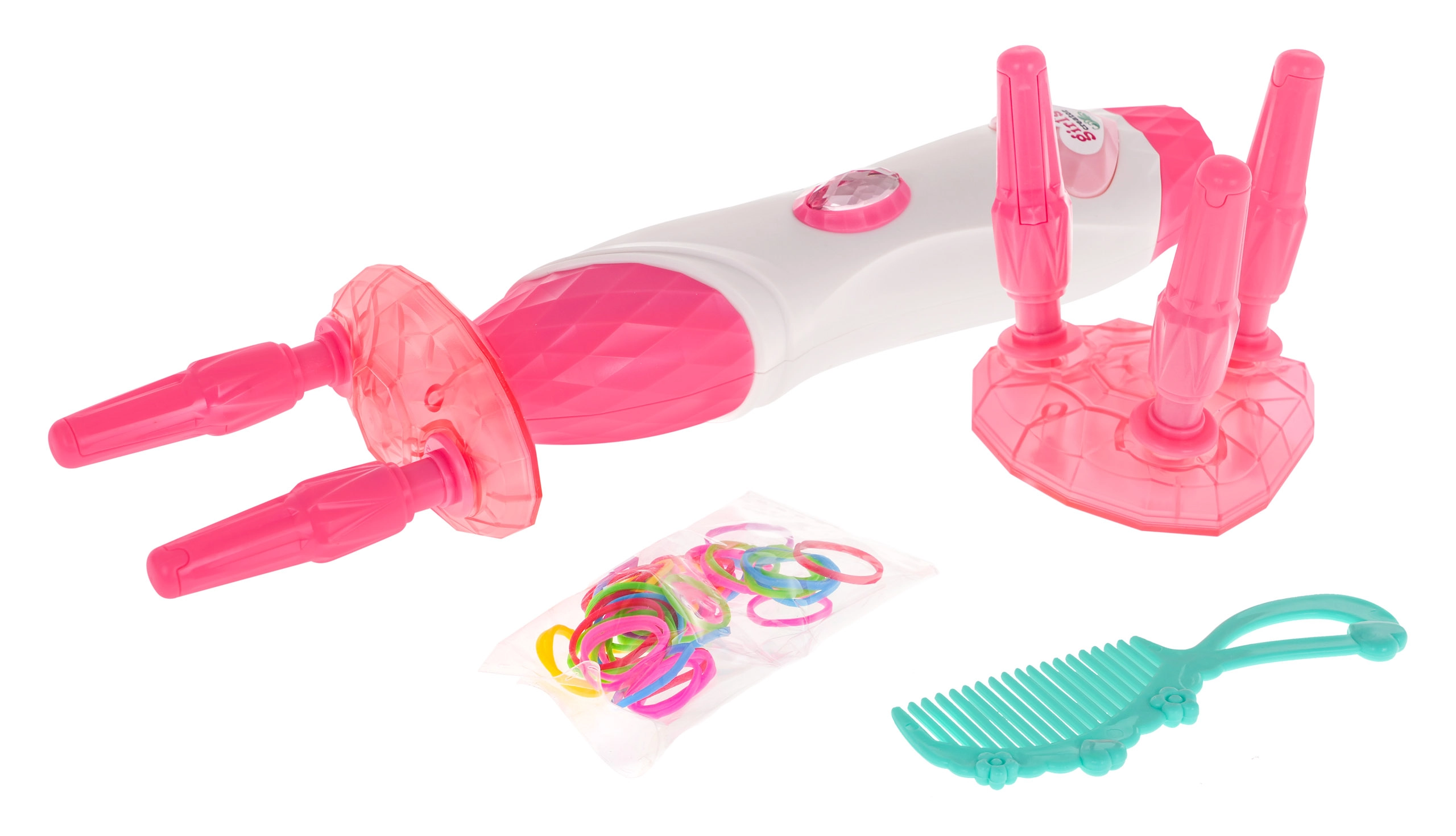 Комплектът за сплитане на плитки е създаден за лесни и забавни прически. Този весел комплект включва пластмасова машинка за сплитане със сменяеми накрайници, гребен и 50 ластика за коса. Достатъчно е да поставите 2 до 3 кичура коса в отворите и с натискане на бутона да създадете красиви плитки!