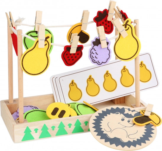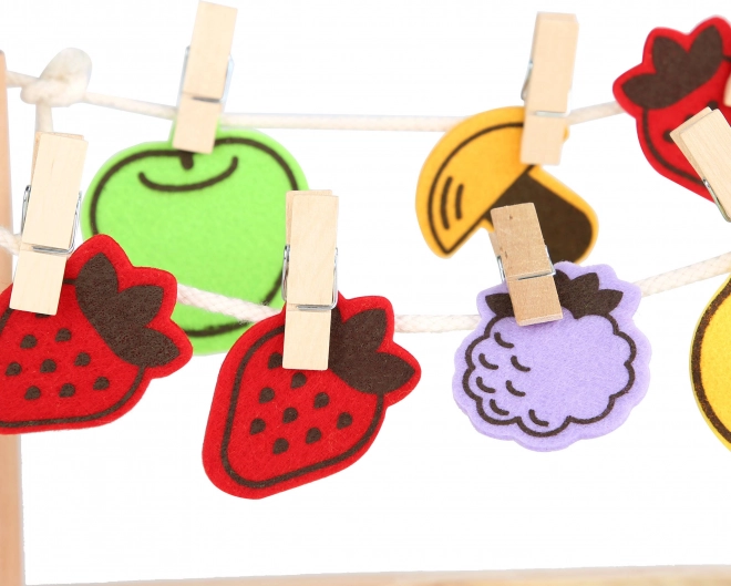 Добавете тази чудесна Монтесори образователна играчка в детската стая и наблюдавайте как децата ви откриват радостта от сушенето на плодове и зеленчуци с помощта на щипки. Играчката е създадена така, че да предложи на децата необичаен начин на опознаване и забавно учене.