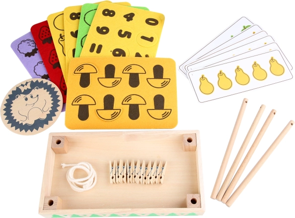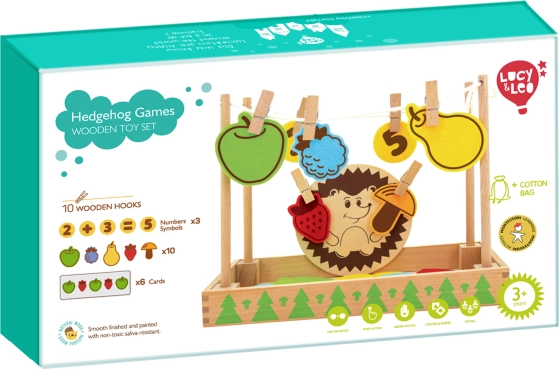 Комплектът включва дървена основа, таралеж, забавни карти и цветни филцови подложки – идеални и за съвместна игра на повече деца. За лесно съхранение всичко е опаковано в практична памучна торбичка.