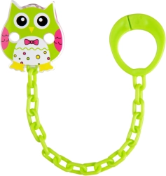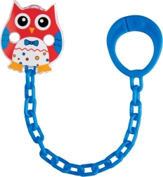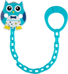 Верижката за биберон с надежден клип защитава биберона от загуба и замърсяване. Веселият мотив със совичка привлича децата, а родителите ще оценят лесното закрепване към дрехите и простата поддръжка – достатъчно е да се измие с топла вода и да се изплакне.