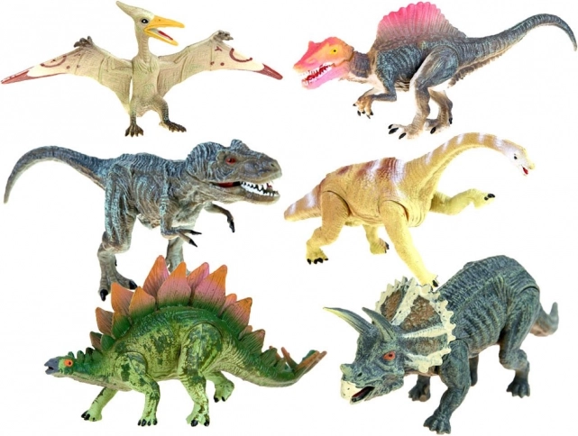 Комплектът включва шест различни вида динозаври, като T-Rex, Стегозавър и други, което осигурява широки възможности за игра и обучение.