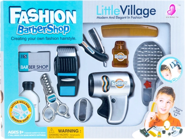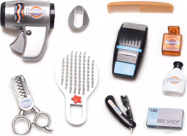 Сетът включва всички необходими инструменти за игра на фризьорски салон – от ножички за подстригване до шишенца с шампоан и одеколон.