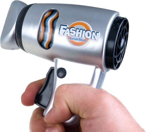 Комплектът включва сешоар, който при натискане на бутона задвижва вътрешен въртящ се барабан за по-реалистично усещане.
