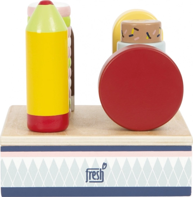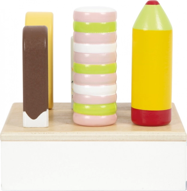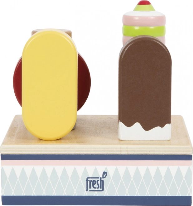 Този дървен комплект сладоледи е идеален за игра на магазин или кафене. Здравата стойка държи всичките шест сладоледа подредени на място, така че малките ръчички лесно да избират любимия „вкус“ и да обслужват клиентите. Благодарение на сертифицираното FSC дърво играчката е не само красива, но и щадяща природата.