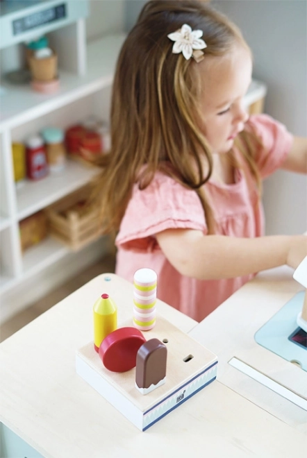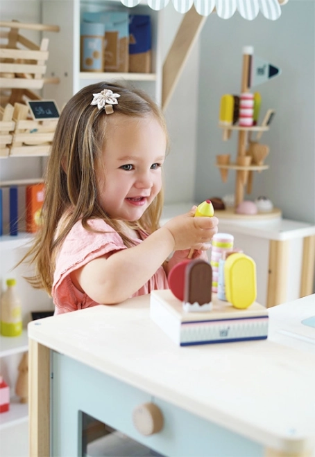Пъстрите сладоледи с реалистични форми приканват към „опитване“ и стимулират креативна игра на продавачи и клиенти.