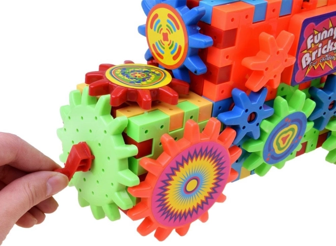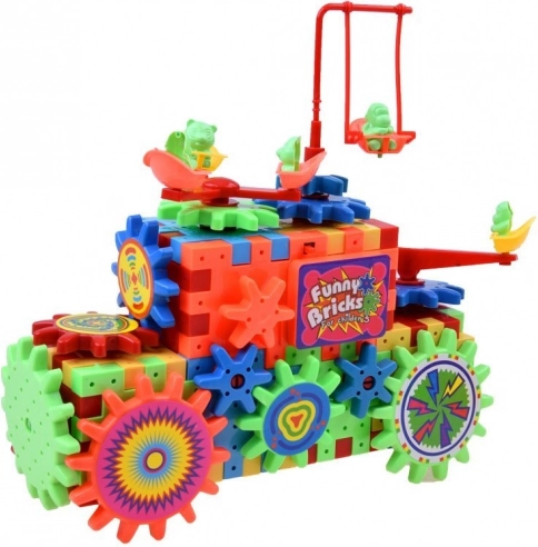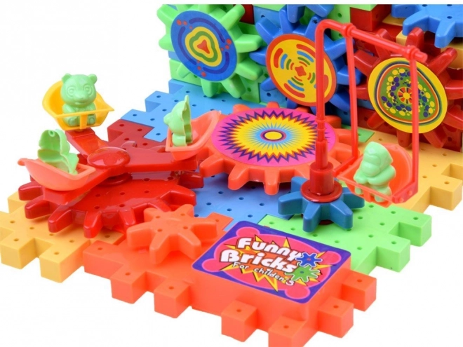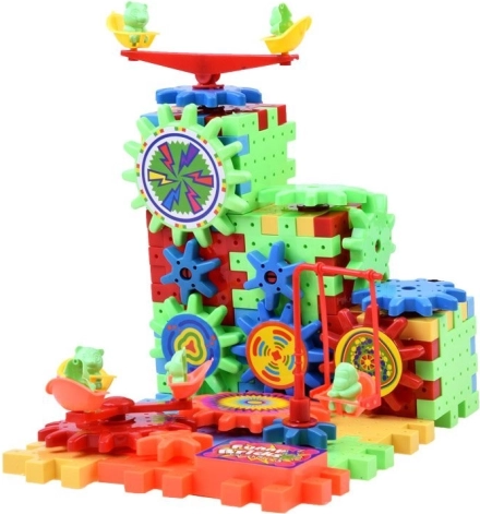 Комплектът включва зъбно колелце, захранвано с AA батерия, което децата могат да използват, за да оживят своите постройки.