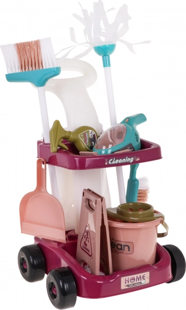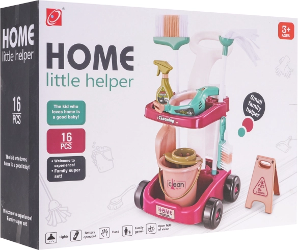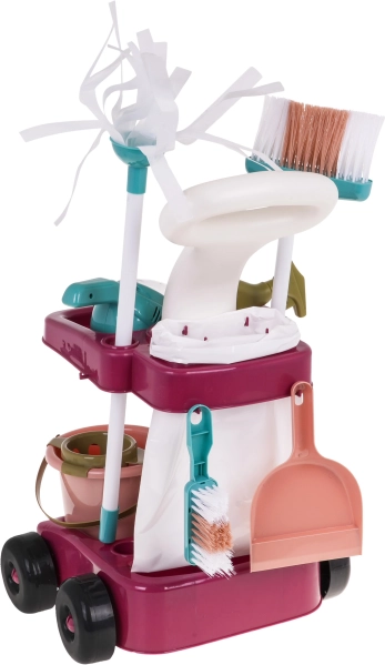 Този богат почистващ комплект е изработен от качествени и безопасни материали и ще впечатли малките помощници с реалистични детайли. Децата тренират моториката, усвояват навици за ред и се забавляват с креативна ролева игра у дома и в детската градина. Количката се управлява лесно благодарение на големите колела и удобната дръжка, а всичко има своето място на практичните полици.