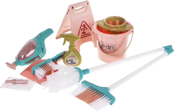 Открийте забавен начин да научите децата на ред – голям почистващ комплект с количка и интерактивен ръчен прахосмукач за деца от 3 години. Стабилната количка на колелца с дръжка и полици събира всички аксесоари: моп и кофа, метла и четка, лопатка със сметло, спрей – атрапа, предупредителна табела и торба за отпадъци. Прахосмукачът на батерии 3× AA предлага светлинни и звукови ефекти, сменяеми накрайници и наистина засмуква включените полистиренови топчета.