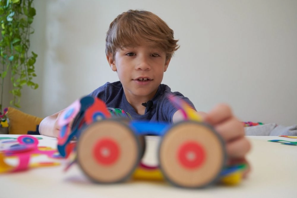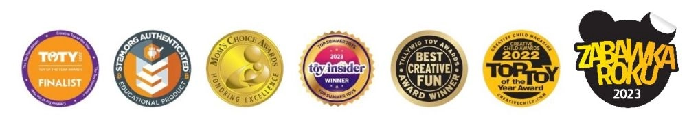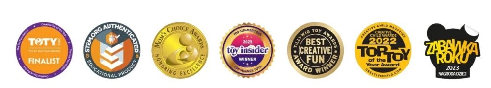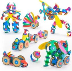 Леките и компактни елементи от рециклируем синтетичен хартон са водоустойчиви и лесни за почистване. Комплектът е идеален за път, училища и детски градини, подпомага STEAM обучението и предлага безброй 2D и 3D комбинации. Включени са брошура с идеи и онлайн вдъхновение в YouTube.