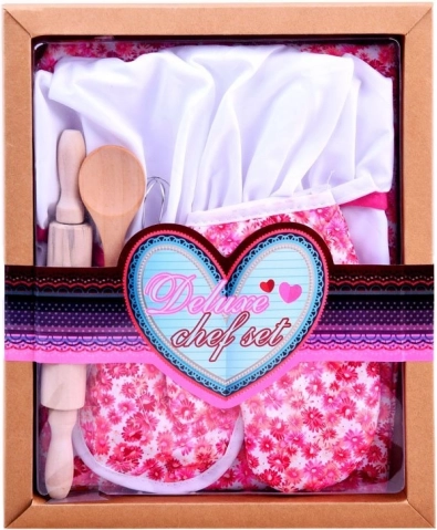 Включва всички необходими неща за малкия готвач: престилка, шапка, ръкавица, подложка и кухненски инструменти.