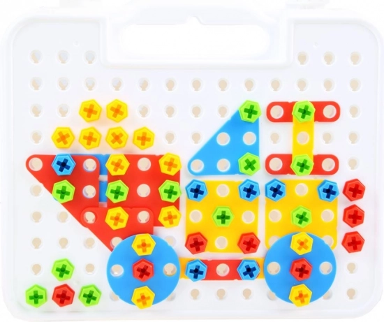 Този креативен конструктор за малки майстори предлага неограничени възможности за строене. Децата могат да създават 2D картинки и 3D модели с помощта на перфорирана дъска, винтове и пъстри елементи в различни форми. Куфарчето с дръжка осигурява лесно пренасяне и подредено съхранение на всички компоненти.