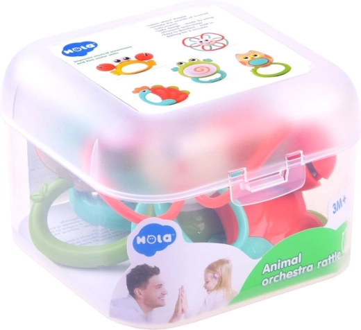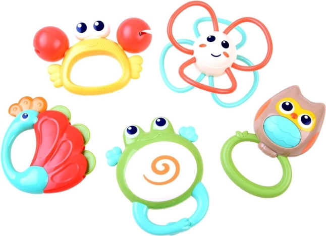 Колекцията дрънкалки предлага пет различни играчки във форма на животни, проектирани за безопасно боравене от малки детски ръчички. Тези дрънкалки не само забавляват вашето дете, но и подпомагат неговото сензорно и моторно развитие.