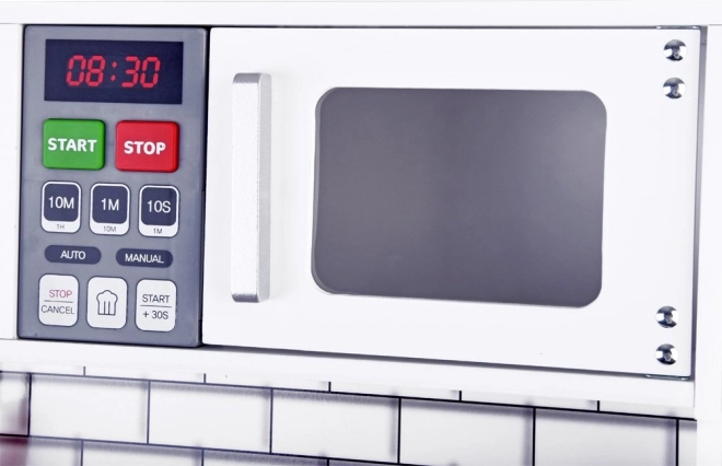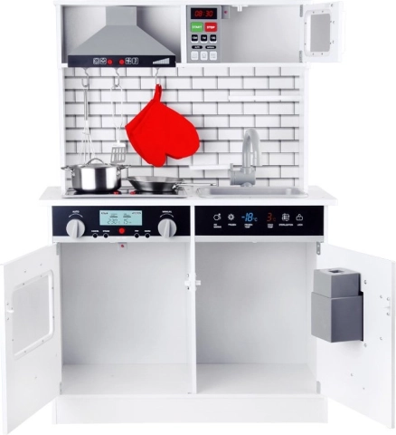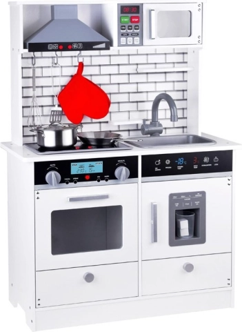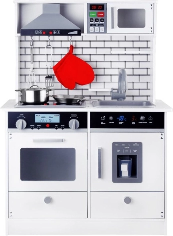 Тази красива дървена кухня е оборудвана с всички необходими уреди, които позволяват на децата да „готвят“ най-вкусните ястия. Белият цвят с модерни плочки идеално се вписва във всеки детски кът или кухненски ъгъл.