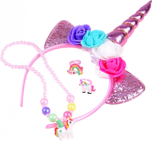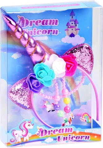 Създайте вълшебен тоалет за миг. Диадемата с еднорог е по цялата дължина покрита с фин сатен, който предпазва детската кожа от раздразнение. Мек розов рог с пенен пълнеж запазва форма, блестящи ушички и пъстроцветни цветя придават приказен чар. Комплектът е допълнен с цветно мънисто колие с висулка еднорог и два пръстена.